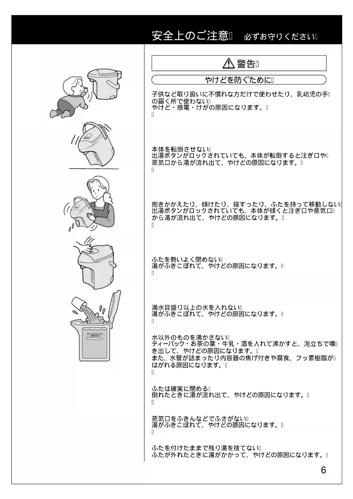 満水目盛り以上の水を入れない 湯がふきこぼれて、やけどの原因になります。