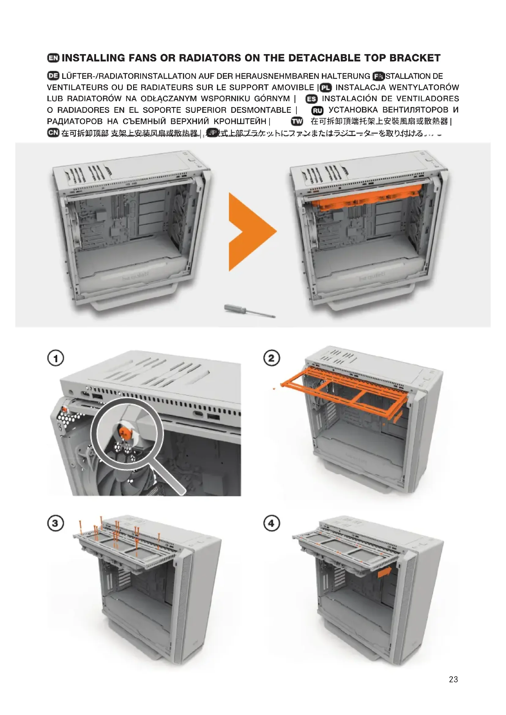 O RADIADORES EN EL SOPORTE SUPERIOR DESMONTABLE | УСТАНОВКА ВЕНТИЛЯТОРОВ И РАДИАТОРОВ НА СЪЕМНЫЙ ВЕРХНИЙ КРОНШТЕЙН | 在可拆卸頂端托架上安裝風扇或散熱器 | 在可拆卸顶部 支架上安装风扇或散热器 | 着脱式上部ブラケットにファンまたはラジエーターを取り付ける 在可拆卸顶部 支架上安装风扇或散热器 | 着脱式上部ブラケットにファンまたはラジエーターを取り付ける 着脱式上部ブラケットにファンまたはラジエーターを取り付ける 着脱式上部ブラケットにファンまたはラジエーターを取り付ける