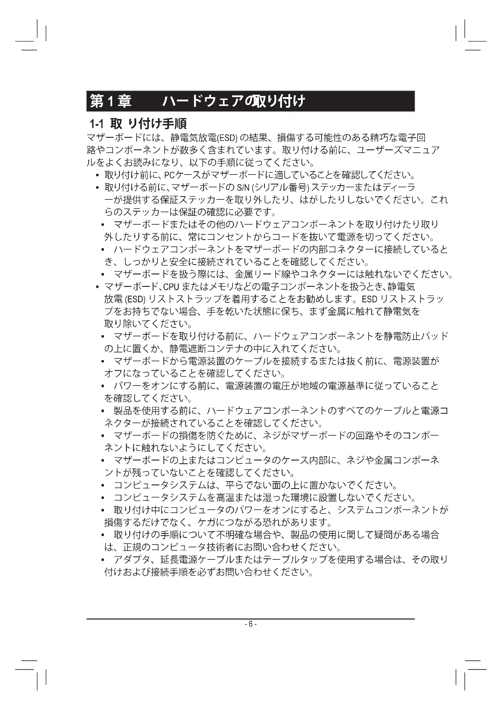 マザーボードには、静電気放電(ESD) の結果、損傷する可能性のある精巧な電子回 路やコンポーネントが数多く含まれています。取り付ける前に、ユーザーズマニュア ルをよくお読みになり、以下の手順に従ってください。