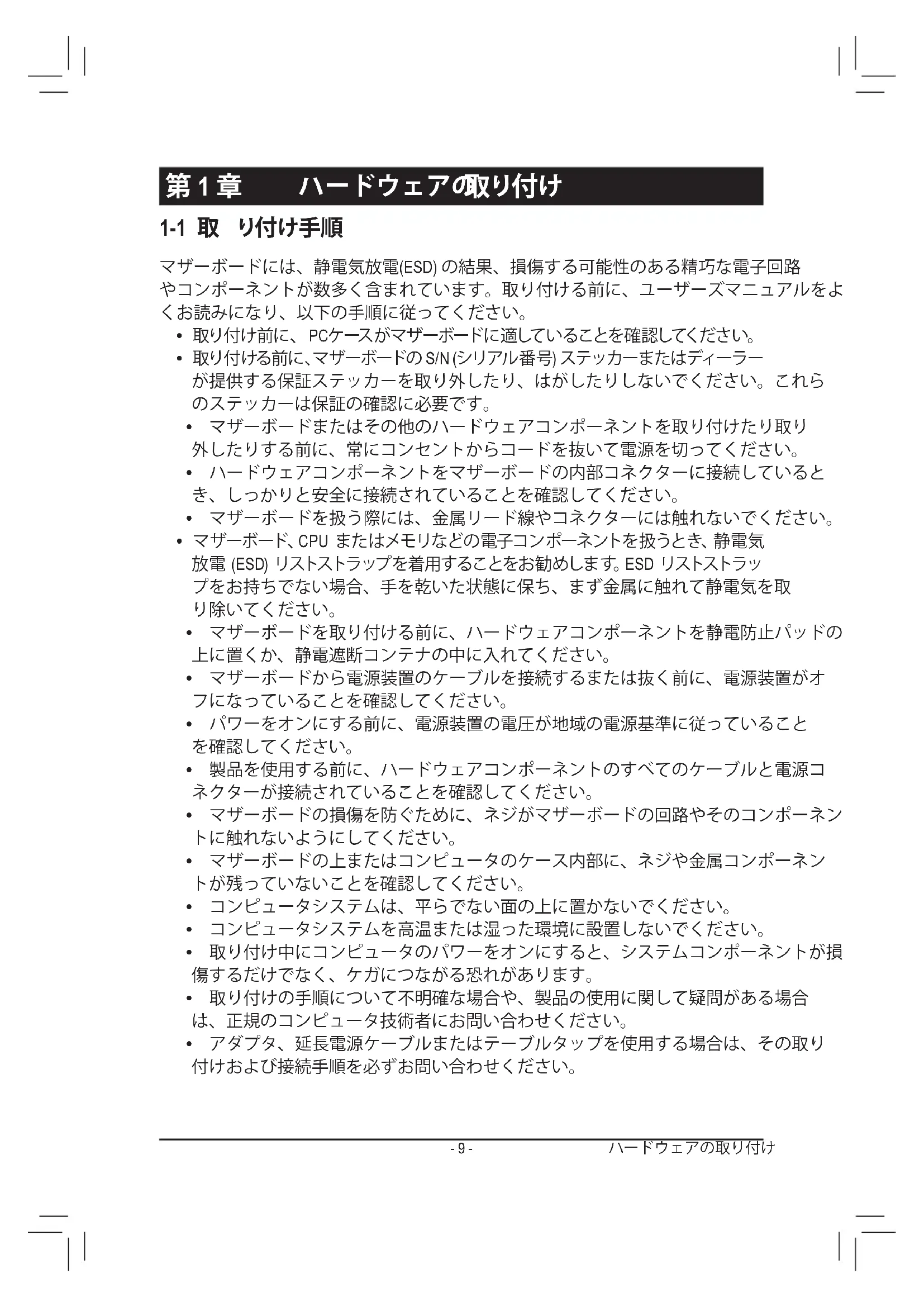 マザーボードには、静電気放電(ESD) の結果、損傷する可能性のある精巧な電子回路 やコンポーネントが数多く含まれています。取り付ける前に、ユーザーズマニュアルをよ くお読みになり、以下の手順に従ってください。