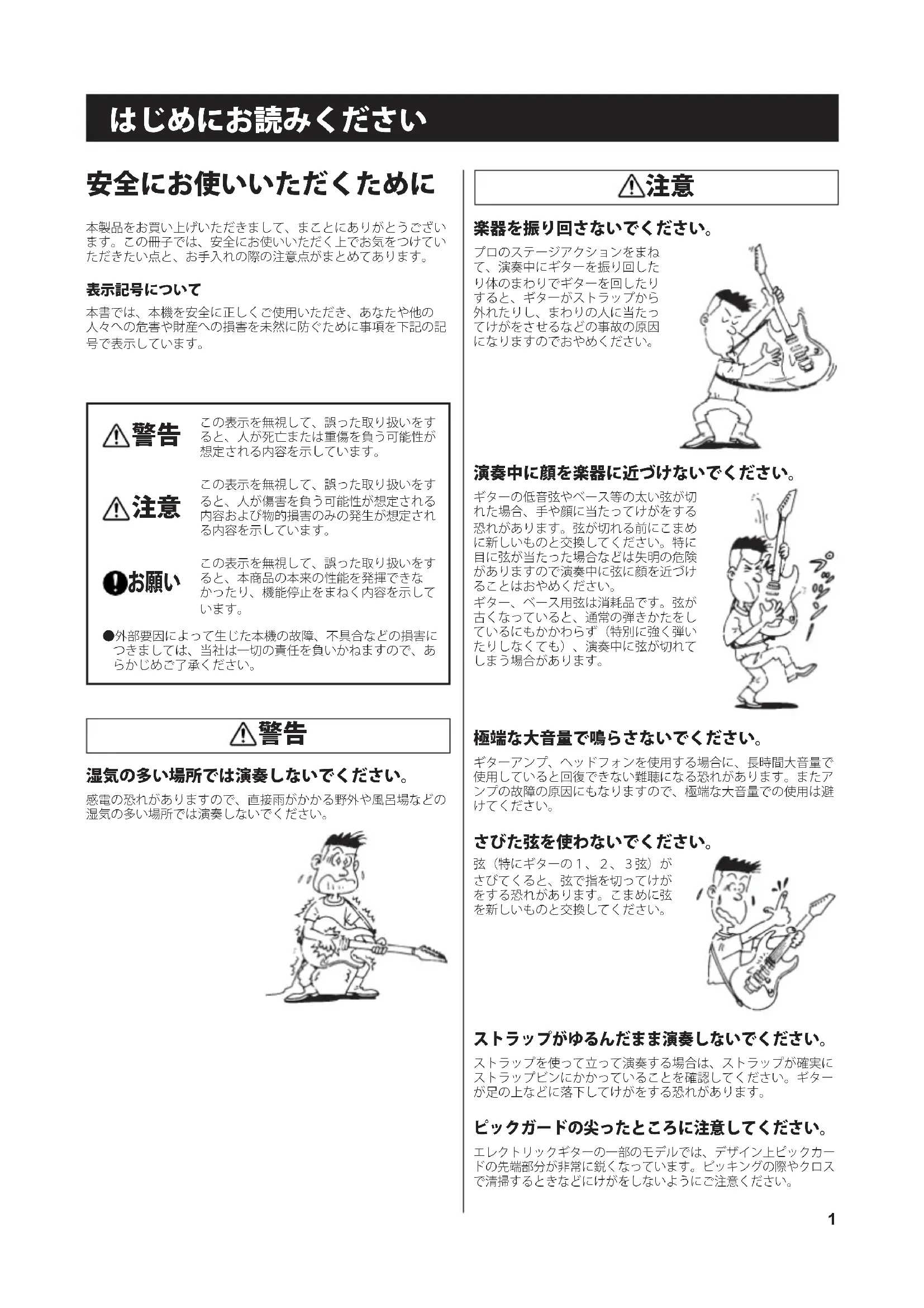 Guitar Electronics .............................................................................................. 227 Guitar Controls .................................................................................................. 228 NA13G222_Regular.indb 2NA13G222_Regular.indb 2 2013-8-9 17:07:032013-8-9 17:07:031 はじめにお読みください 安全にお使いいただくために 本製品をお買い上げいただきまして、まことにありがとうございます。この冊子では、安全にお使いいただく上でお気をつけていただきたい点と、お手入れの際の注意点がまとめてあります。表示記号について本書では、本機を安全に正しくご使用いただき、あなたや他の人々への危害や財産への損害を未然に防ぐために事項を下記の記号で表示しています。