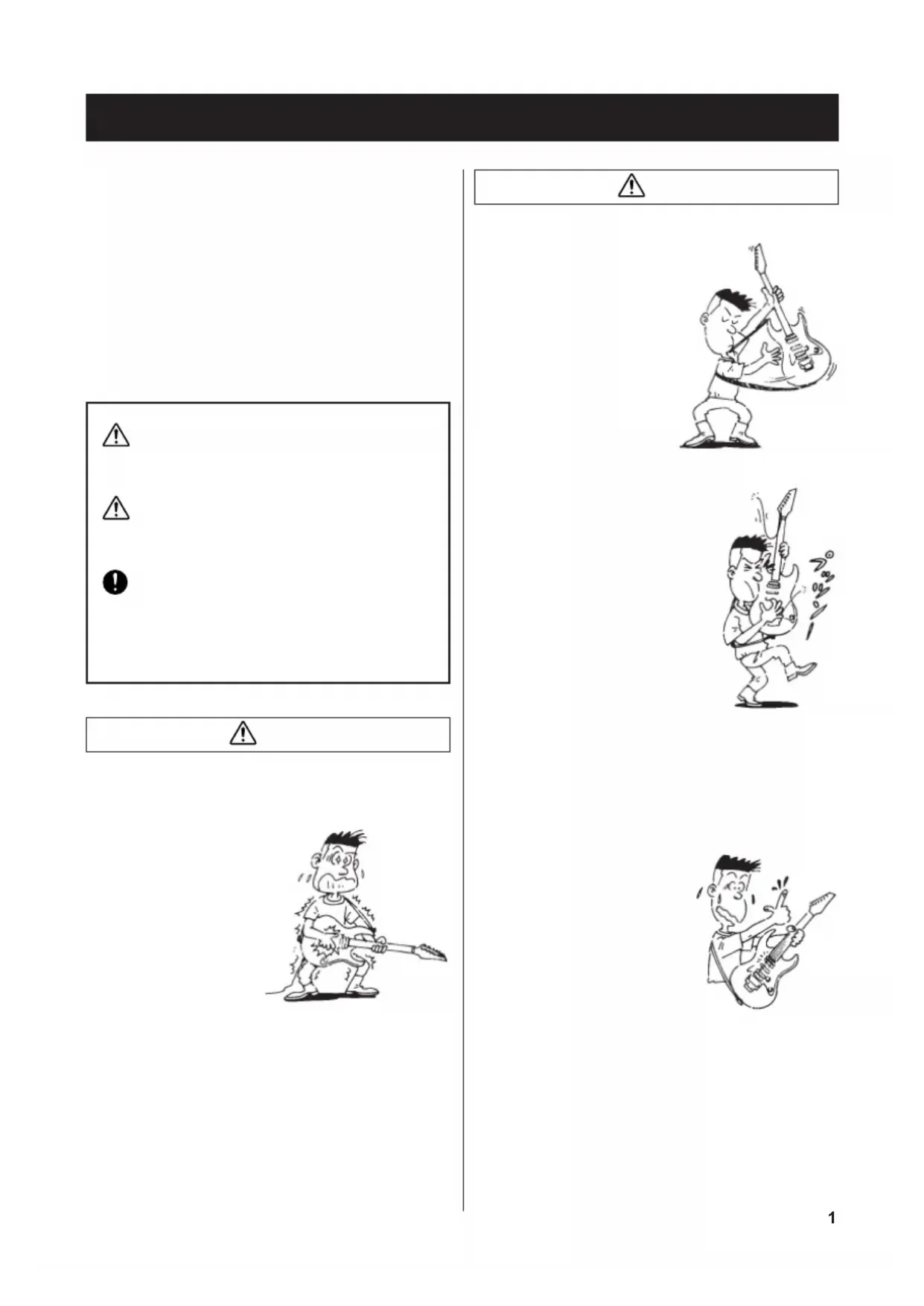 楽器を振り回さないでください。 プロのステージアクションをまねて、演奏中にギターを振り回したり体のまわりでギターを回したりすると、ギターがストラップから外れたりし、まわりの人に当たってけがをさせるなどの事故の原因になりますのでおやめください。 演奏中に顔を楽器に近づけないでください。 ギターの低音弦やベース等の太い弦が切れた場合、手や顔に当たってけがをする恐れがあります。弦が切れる前にこまめに新しいものと交換してください。特に目に弦が当たった場合などは失明の危険がありますので演奏中に弦に顔を近づけることはおやめください。ギター、ベース用弦は消耗品です。弦が古くなっていると、通常の弾きかたをしているにもかかわらず(特別に強く弾いたりしなくても)、演奏中に弦が切れてしまう場合があります。 極端な大音量で鳴らさないでください。 ギターアンプ、ヘッドフォンを使用する場合に、長時間大音量で使用していると回復できない難聴になる恐れがあります。またアンプの故障の原因にもなりますので、極端な大音量での使用は避けてください。 さびた弦を使わないでください。 弦(特にギターの1、2、3弦)がさびてくると、弦で指を切ってけがをする恐れがあります。こまめに弦を新しいものと交換してください。 ストラップがゆるんだまま演奏しないでください。 ストラップを使って立って演奏する場合は、ストラップが確実にストラップビンにかかっていることを確認してください。ギターが足の上などに落下してけがをする恐れがあります。 ピックガードの尖ったところに注意してください。 エレクトリックギターの一部のモデルでは、デザイン上ピックカードの先端部分が非常に鋭くなっています。ピッキングの際やクロスで清掃するときなどにけがをしないようにご注意ください。