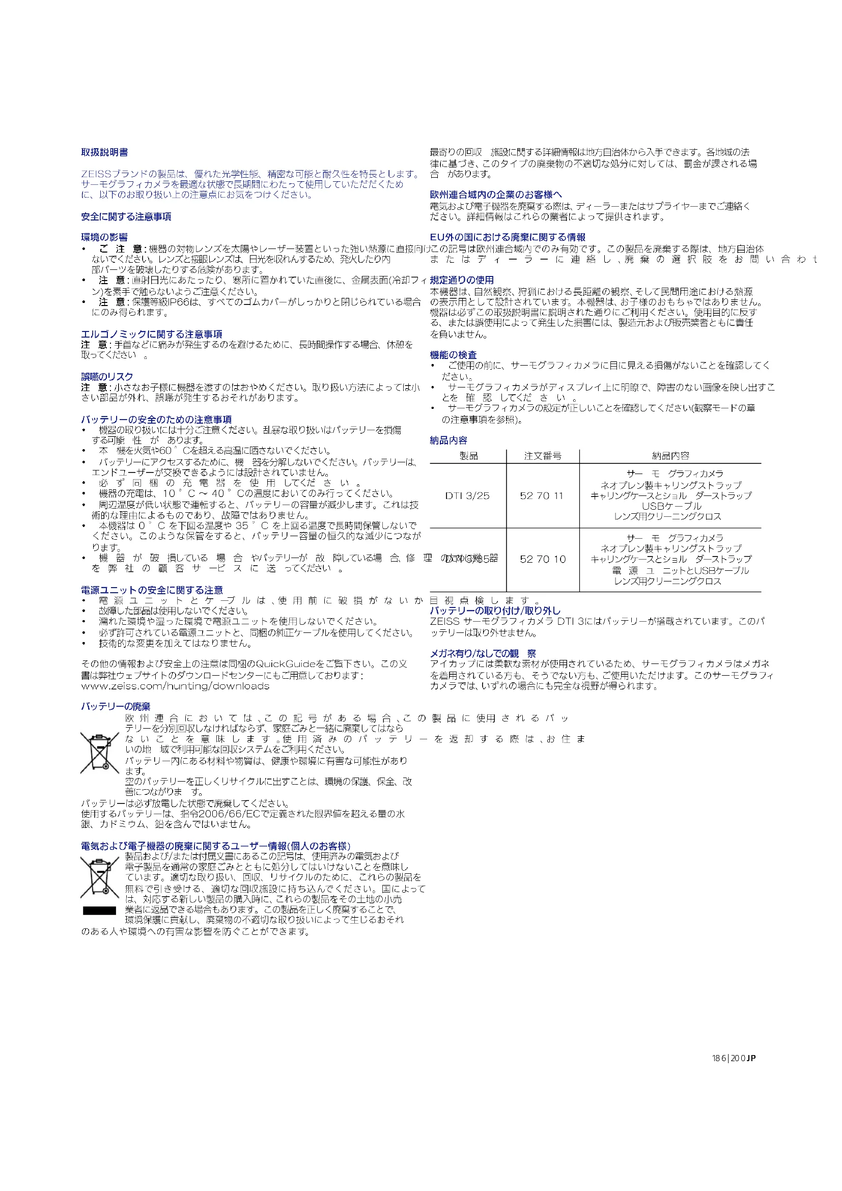 CarlZeissAG Carl-Zeiss-Strasse22 D-73447Oberkochen www.zeiss.com/natureおよびwww.zeiss.com/hunting 技術的改善のために、仕様および納品内容は変更される可能性があります。 誤りや 誤 植 に 関して当 社は一切 責 任 はを負 いま せん 。 データ保護に関する注意事項 DTI3の使用においては、個人に関するデータが処理されます。 データ保護と個人に関するデータの処理についての当社からの注意情報は、 ダウンロードセンター(www.zeiss.com/hunting/manuals)にアクセス