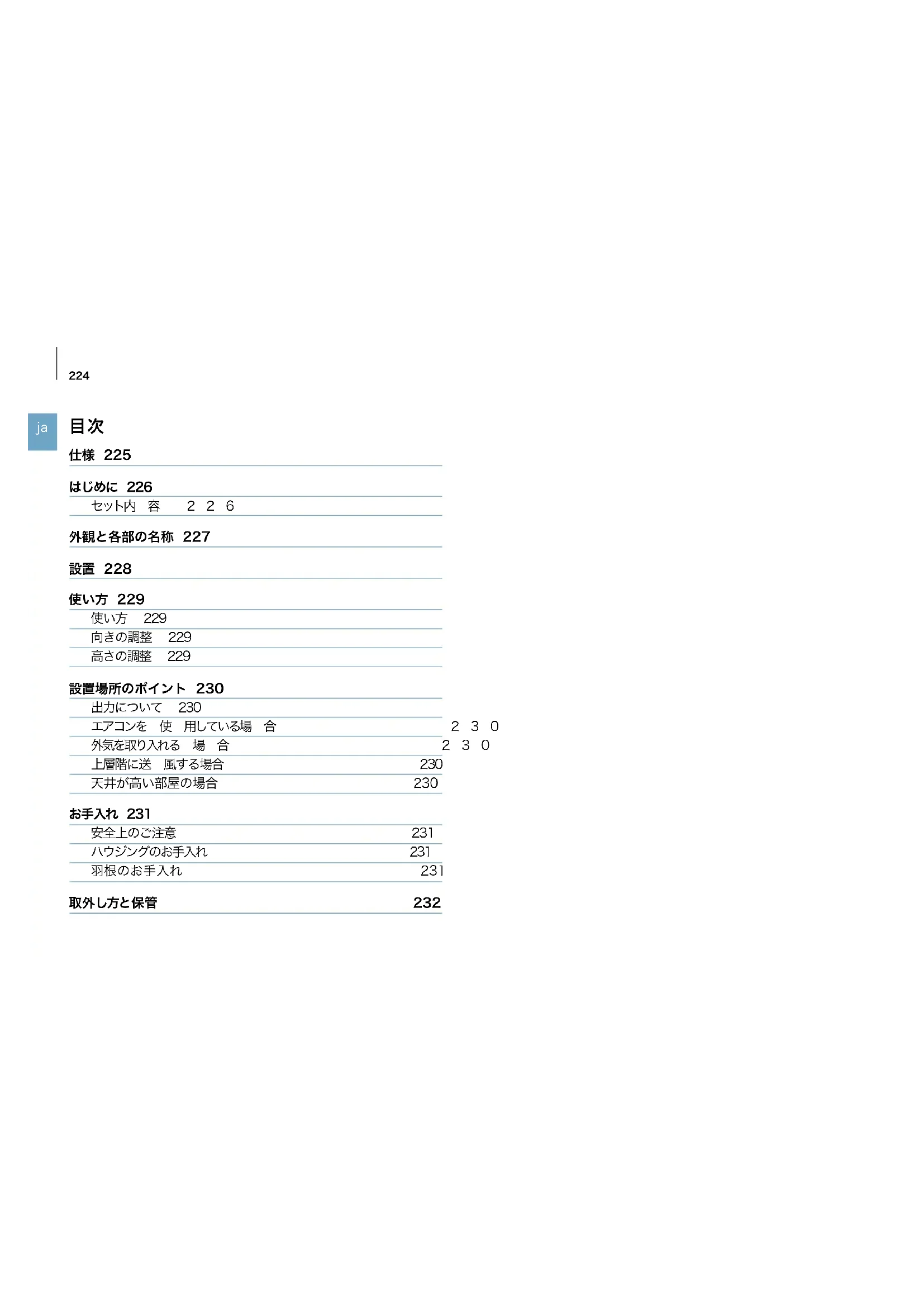 仕様 225 はじめに 226 セット内 容 2 2 6 外観と各部の名称 227 設置 228 使い方 229 使い方 229 向きの調整 229 高さの調整 229 設置場所のポイント 230 出力について 230 エアコンを 使 用している場 合 2 3 0 外気を取り入れる 場 合 2 3 0 上層階に送 風する場合 230 天井が高い部屋の場合 230 お手入れ 231 安全上のご注意 231 ハウジングのお手入れ 231 羽根のお手入れ 231 取外し方と保管 232225