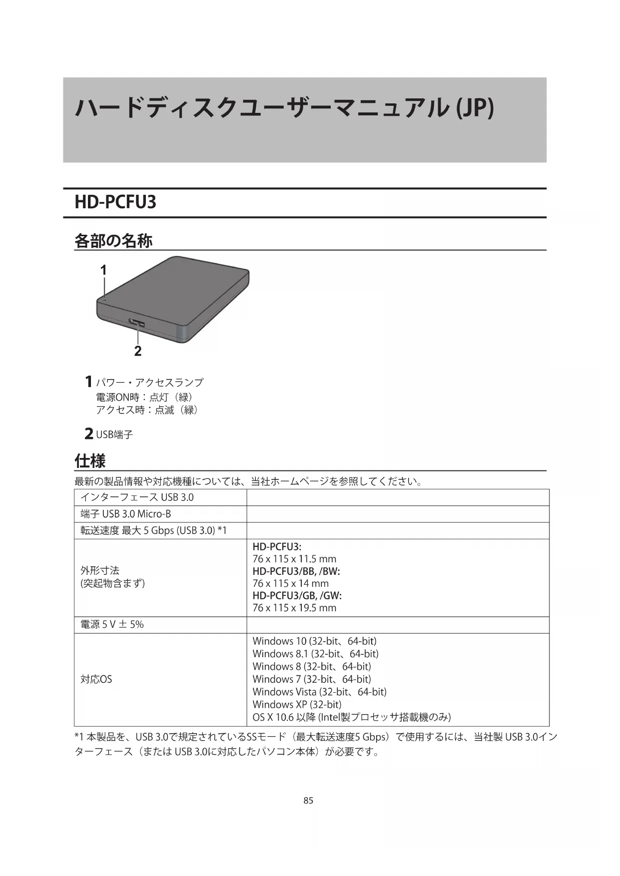 HD-PCFU3: 76 x 115 x 11.5 mm HD-PCFU3/BB, /BW: 76 x 115 x 14 mm HD-PCFU3/GB, /GW: 76 x 115 x 19.5 mm 電源 5 V ± 5% 対応OS Windows 10 (32-bit、64-bit) Windows 8.1 (32-bit、64-bit) Windows 8 (32-bit、64-bit) Windows 7 (32-bit、64-bit) Windows Vista (32-bit、64-bit) Windows XP (32-bit) OS X 10.6 以降 (Intel製プロセッサ搭載機のみ) *1 本製品を、USB 3.0で規定されているSSモード(最大転送速度5 Gbps)で使用するには、当社製 USB 3.0イン ターフェース(または USB 3.0に対応したパソコン本体)が必要です。86 HD-PUSU3