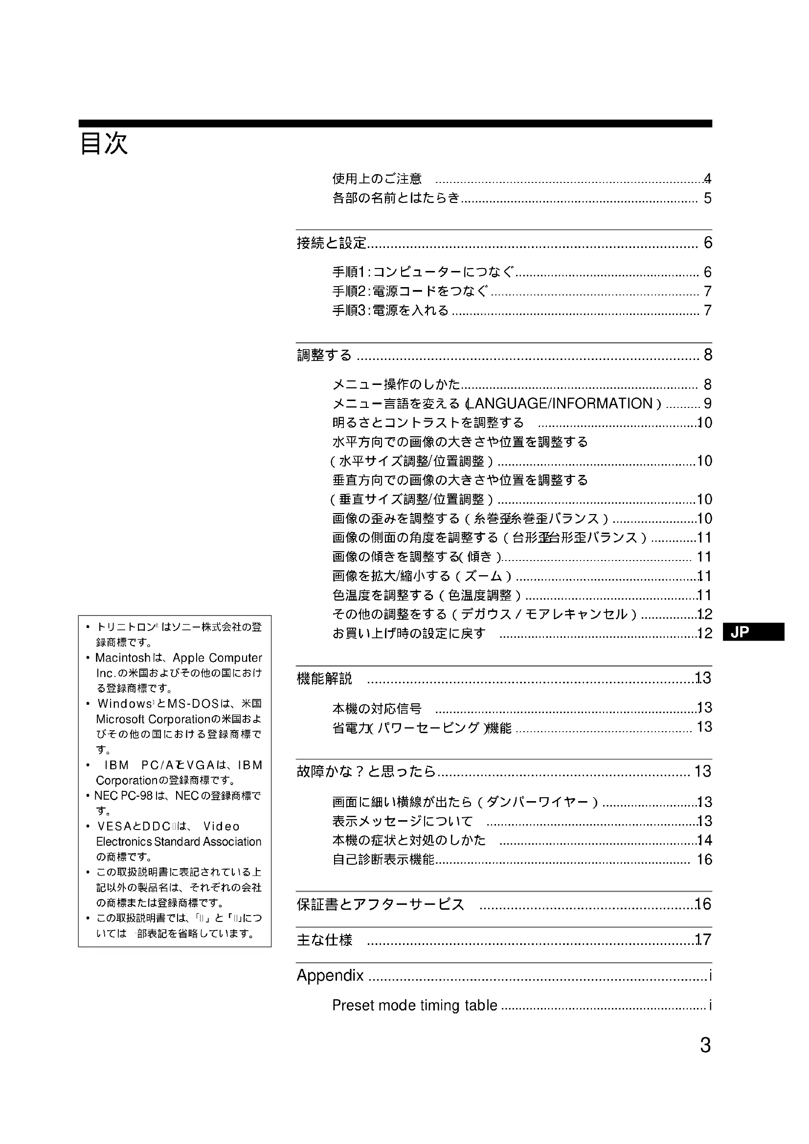 CPD-E100 製造番号:故障の状態:できるだけくわしく購入年月日:お買い上げ店 TEL. お近くのサービスステーション TEL. This display is designed for use in Japan only and cannot be used in any other country. MENU17