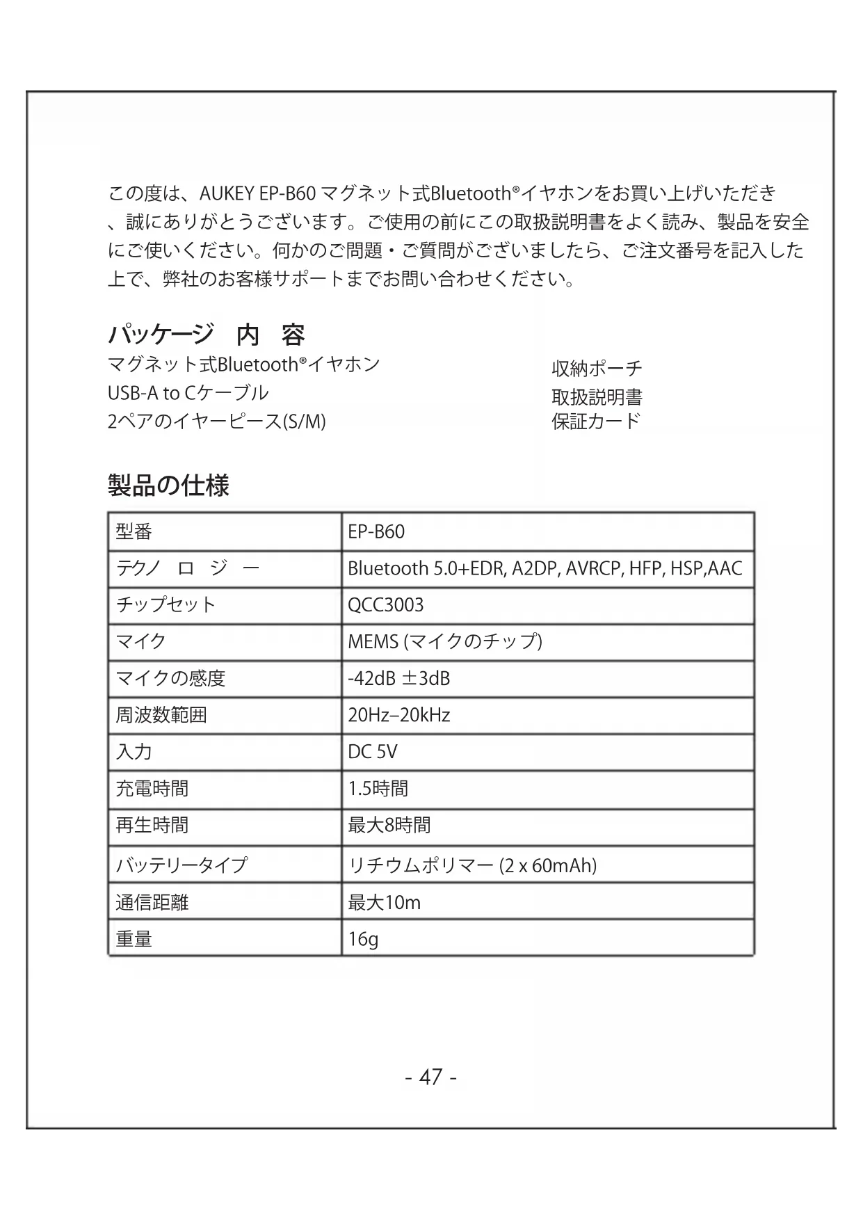 Eメール:support.jp@aukey.com *当社は、AUKEY公式ショップまたは当社が認める小売業者から購入された製品の みに対して、アフターサービスと製品保証を提供しております。他の小売業者から購 入された製品の交換、返品、返金に関しましては購入先へお問い合わせ下さい。 液体がある場所や異常に温度が高くなるところへ置かないでください。 長い時間でイヤホンを高音量で使用しないでください、永久性の聴力損傷ある いは損害を招く恐れがあります。Model: EP-B60 208-170145