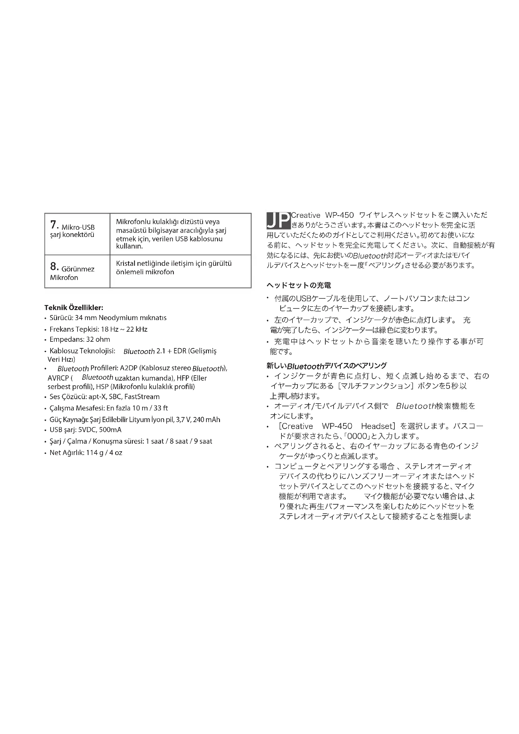 - Ses Çözücü: apt-X, SBC, FastStream• Çalışma Mesafesi: En fazla 10 m / 33 ft• Güç Kaynağı: Şarj Edilebilir Lityum İyon pil, 3,7 V, 240 mAh • USB şarj: 5VDC, 500mA• Şarj / Çalma / Konuşma süresi: 1 saat / 8 saat / 9 saat• Net Ağırlık: 114 g / 4 oz Creative WP-450 ワイヤレスヘッドセットをご購入いただ きあ りがとうご ざい ます。本 書 は この ヘッド セット を完 全 に 活 用していただくた めの ガイドとしてご 利 用ください 。初 めてお 使い にな る前に、ヘッドセットを完全に充電してください。次に、自動接続が有効になるには、先にお使いのBluetooth対 応オー ディオまたはモバイ ル デ バイス とヘッド セットを 一 度「 ペアリン グ 」さ せる 必 要 が ありま す。
