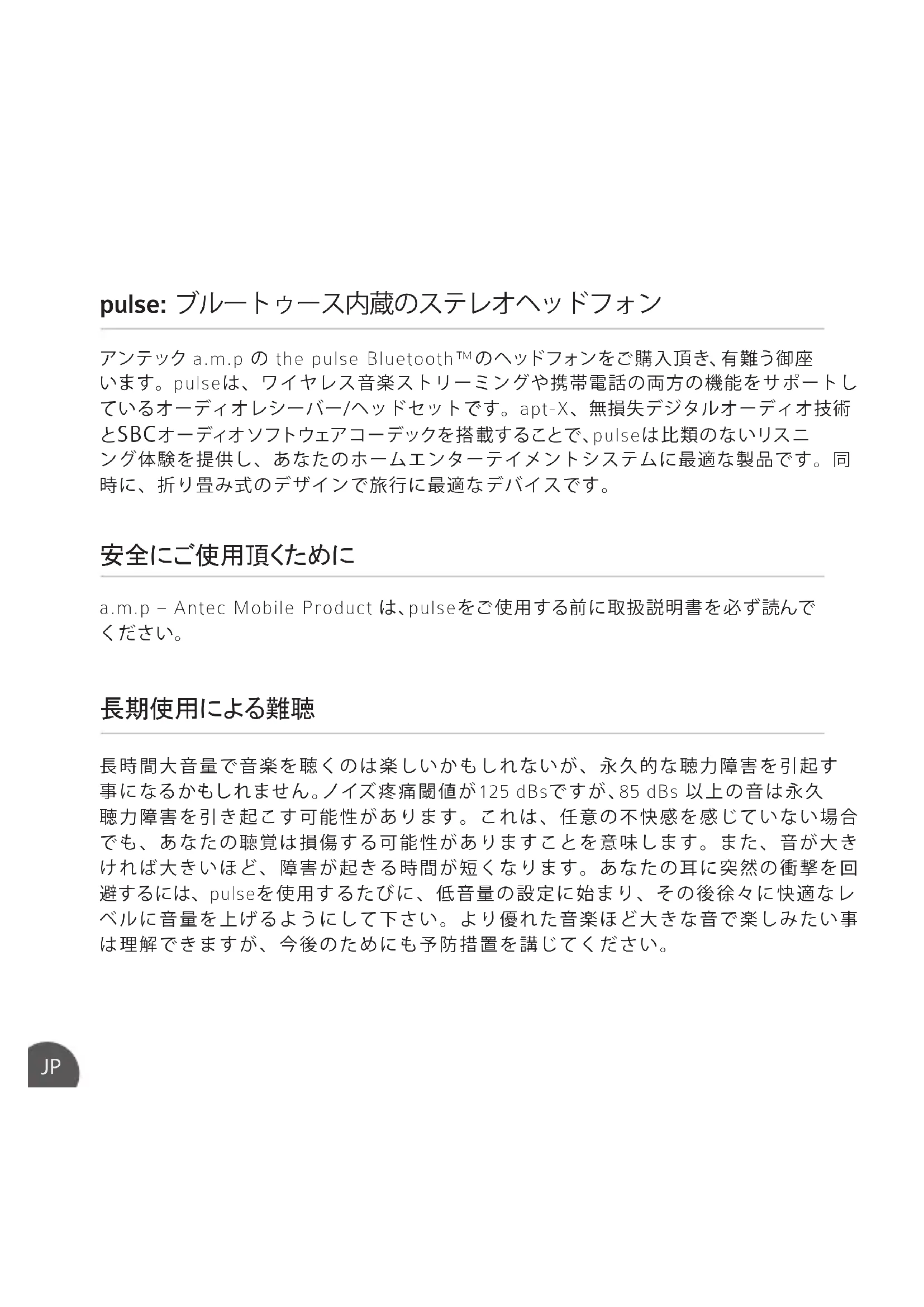 pulse: ブルートゥース内蔵のステレオヘッドフォン 安全にご使用頂くために 長期使用による難聴機械の操作中や運転中は重要な安全信号を聞くため、ご使用ならないで下さい。ま た、図書館や公共交通機関に配慮してpulseの誤使用はお控え下さい。最後に、pulse の修理や分解、または改造しないでください。