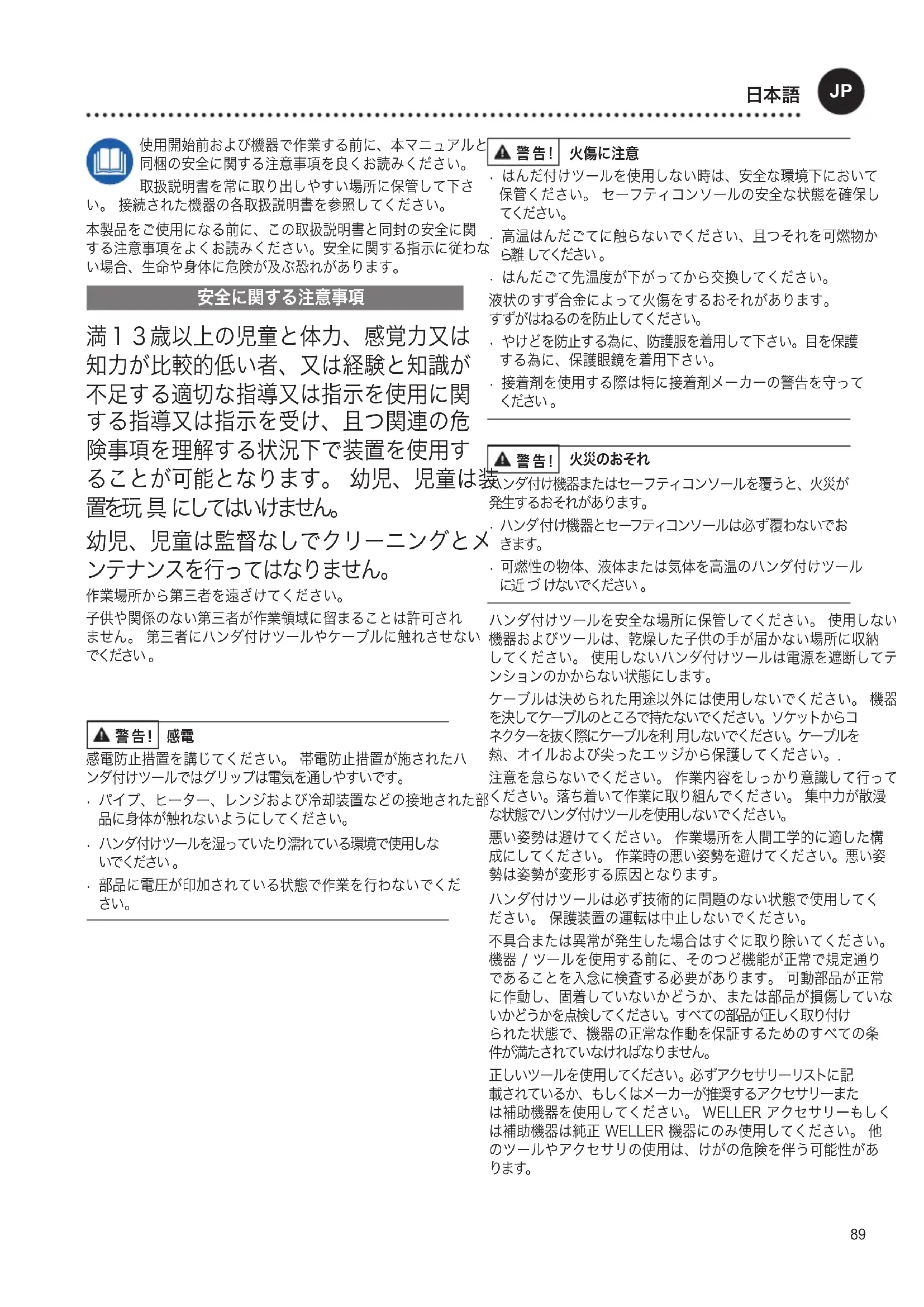 装置が引き渡されてから一年以上となる場合、購入者はツール の物理的欠陥で損害賠償を請求してはならない。この規定は購 入者の§§ 478, 479 BGB (ドイツ連邦法律広報)による損害賠 償請求に適用しません。 使用される前に、用語「保証」を使用して書面で品質又は耐久性 保証を提供することを除き、我々は我々が提供した保証によって 引き起こされる損害賠償に対しての一切の責任を負いません。 不適切な使用又は許認可ない者の装置改造によって引き起こさ れる装置の破損については、一切の保証は全て無効になります。 記載の技術、仕様情報は予告なく変更になることがございます。 更に多くの情報が必要な場合は弊社ホームページをご覧くださ い www.weller-tools.com.91