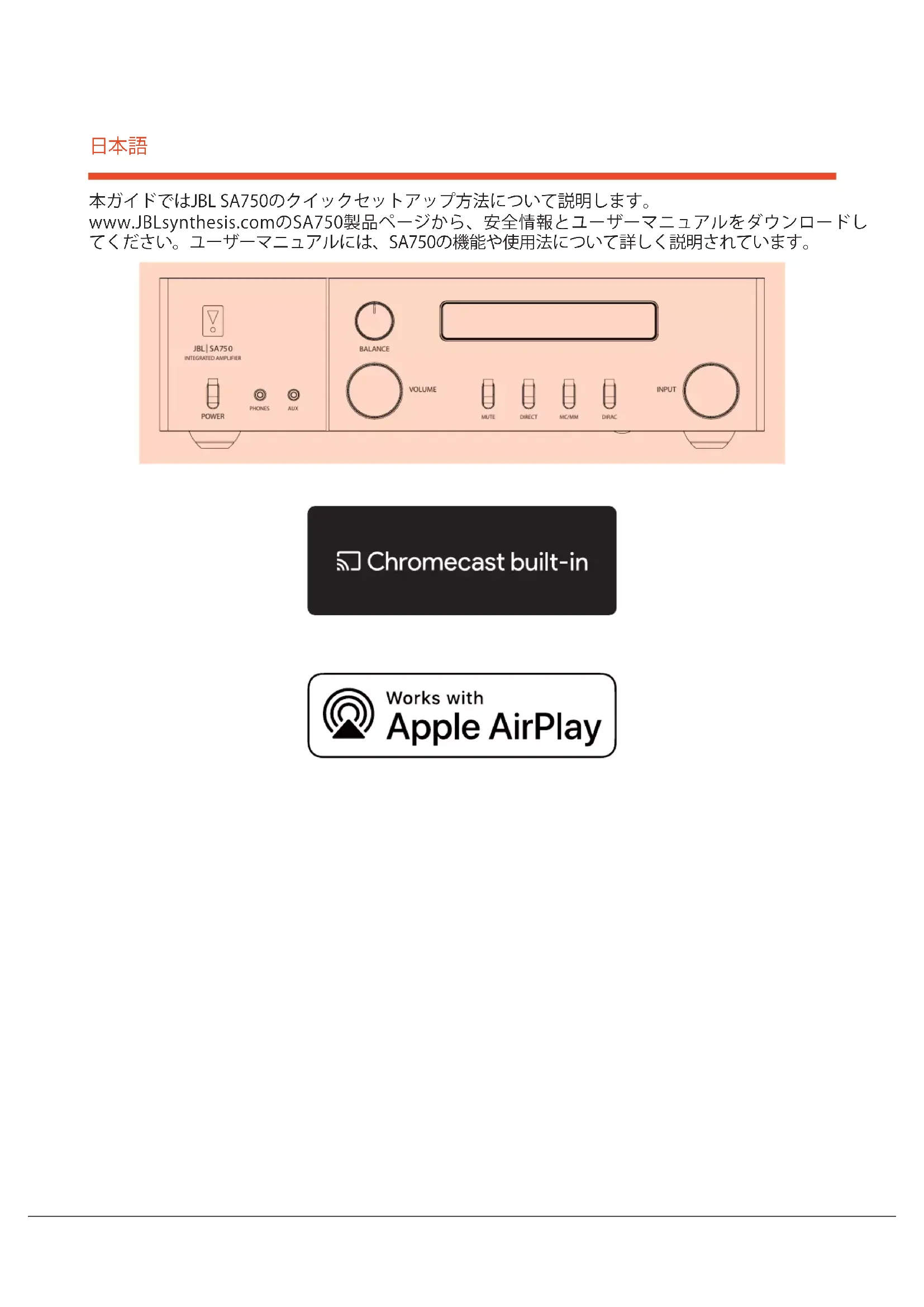 本ガイドではJBL SA750のクイックセットアップ方法について説明します。 www.JBLsynthesis.comのSA750製品ページから、安全情報とユーザーマニュアルをダウンロードし てください。ユーザーマニュアルには、SA750の機能や使用法について詳しく説明されています。 POWER PHONES AUX INTEGRATED AMPLIFIER JBL