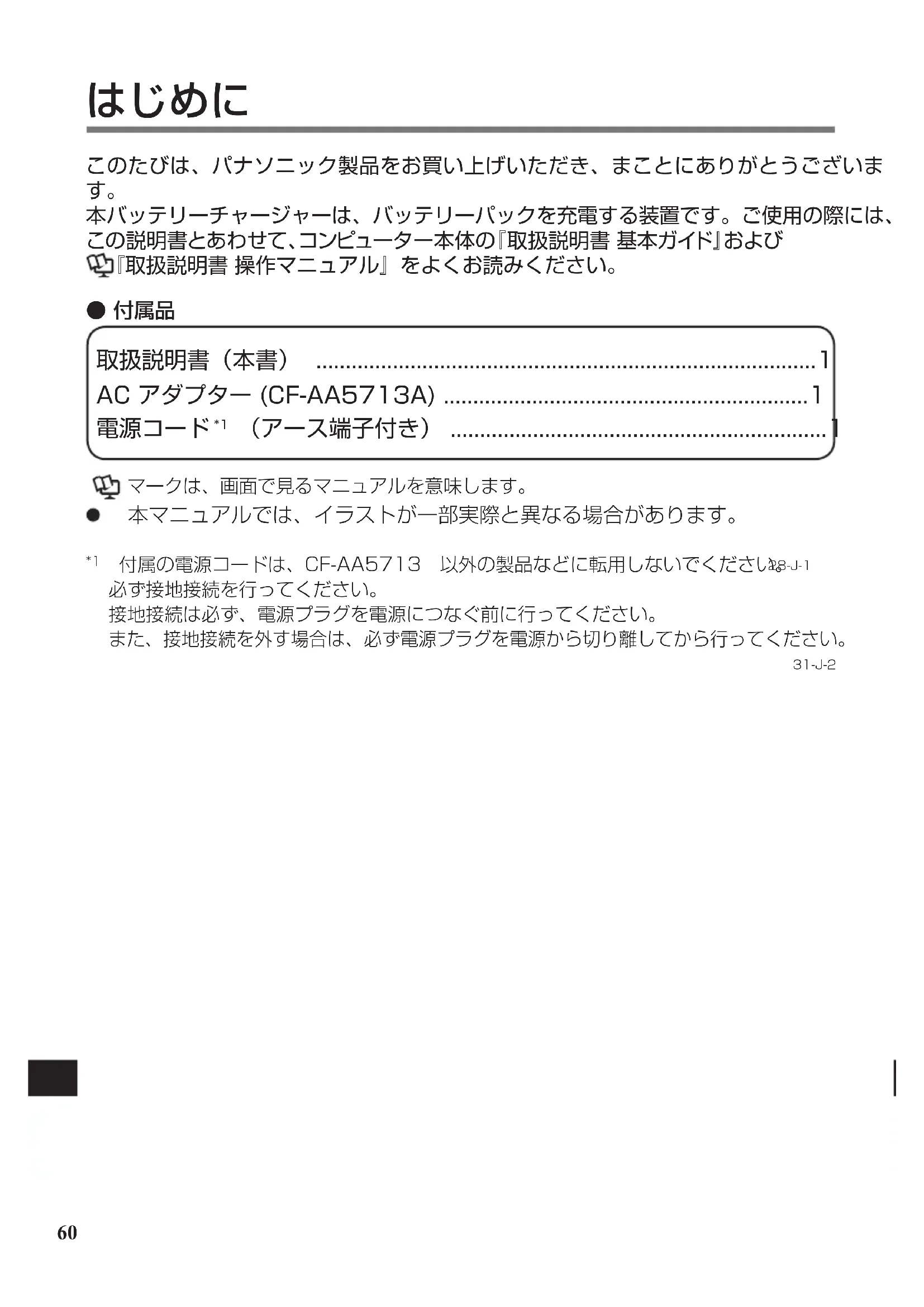 付属の電源コードは、CF-AA5713 以外の製品などに転用しないでください。 28-J-1 必ず接地接続を行ってください。 接地接続は必ず、電源プラグを電源につなぐ前に行ってください。 また、接地接続を外す場合は、必ず電源プラグを電源から切り離してから行ってください。 31-J-2 DHQX1330ZA_T1_VCB331_FM171_OI_17L.indb 60 2017/05/25 14:57:1161