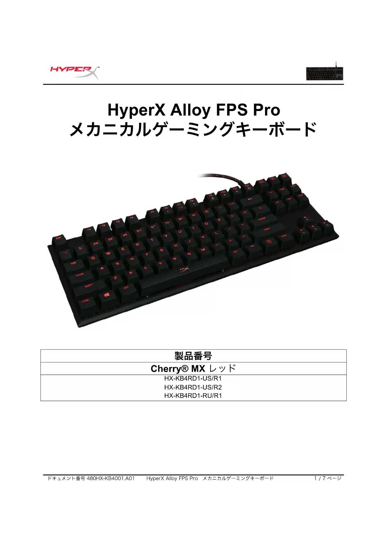 ドキュメント番号480HX-KB4001.A01 HyperXAlloyFPSPro メカニカルゲーミングキーボード 7/7ページ