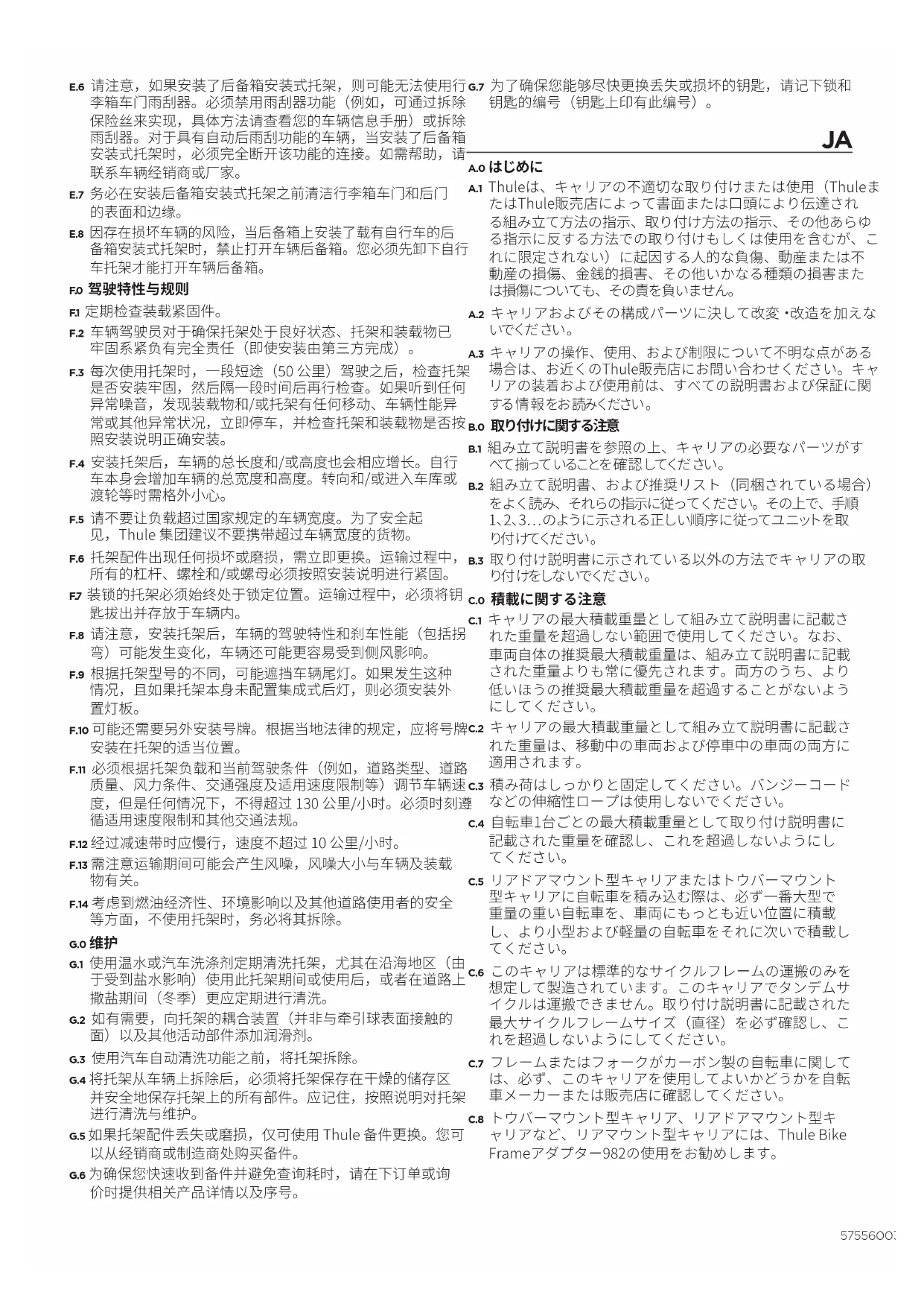 F.2 キャリアを万全な状態に維持し、キャリアと積み荷の安全な 固定状態を維持することは、すべて車両のドライバーご自身 の責任において行ってください(キャリアの取り付けが第三 者によって行われた場合も含め)。 F.3 キャリアを使用する前は、短い距離(50km)を走行後にキャ リアの取り付けが確実であることを確認してください。その 後も定期的に取り付けの固定を確認してください。平常時と 異なる雑音が聞こえたり、積み荷やキャリアが動いたりする など、車両の挙動その他に異常な点がある場合は、搬送を 一度中断してキャリアおよび積み荷の固定をチェックし、取 り付け説明書に従って確認作業を実施してください。595560032001 F.4 車両の全長および全幅は、キャリアを取り付けることで増加 する場合があります。また、自転車を積載することでも車両 の全長および全幅が増加する場合があります。バックする際 やガレージ、フェリーなどに入る際は特に注意してください。 F.5 積載物は、車幅に関する国の規制を超えないようにしてください。安全 上の理由から、Thule Groupは車幅を超える積荷を積載しないよう推