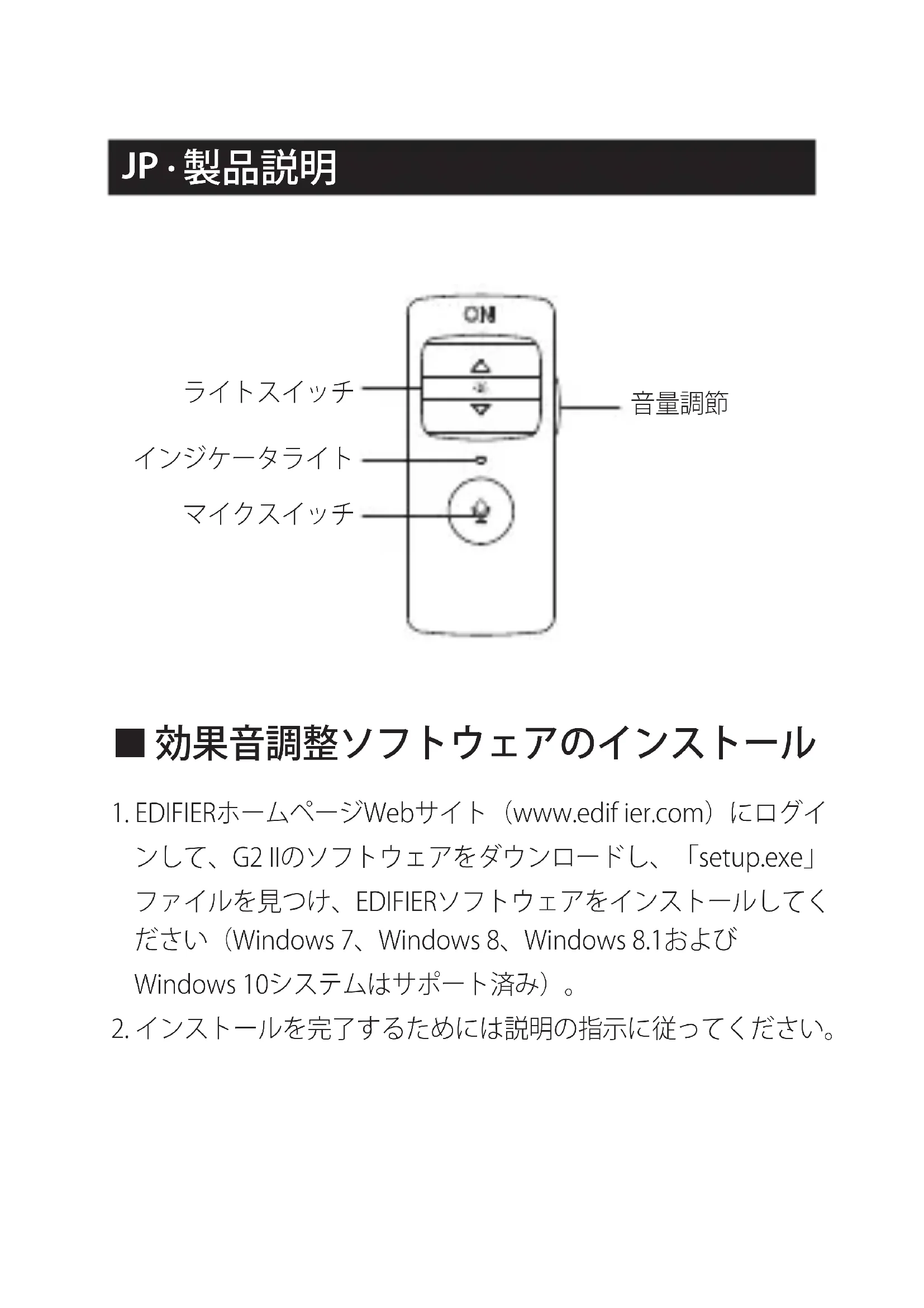 効果音調整ソフトウェアのインストール 1.EDIFIERホームページWebサイト(www.edifier.com)にログイ ンして、G2IIのソフトウェアをダウンロードし、「setup.exe」 ファイルを見つけ、EDIFIERソフトウェアをインストールしてく ださい(Windows7、Windows8、Windows8.1および Windows10システムはサポート済み)。 2.インストールを完了するためには説明の指示に従ってください。