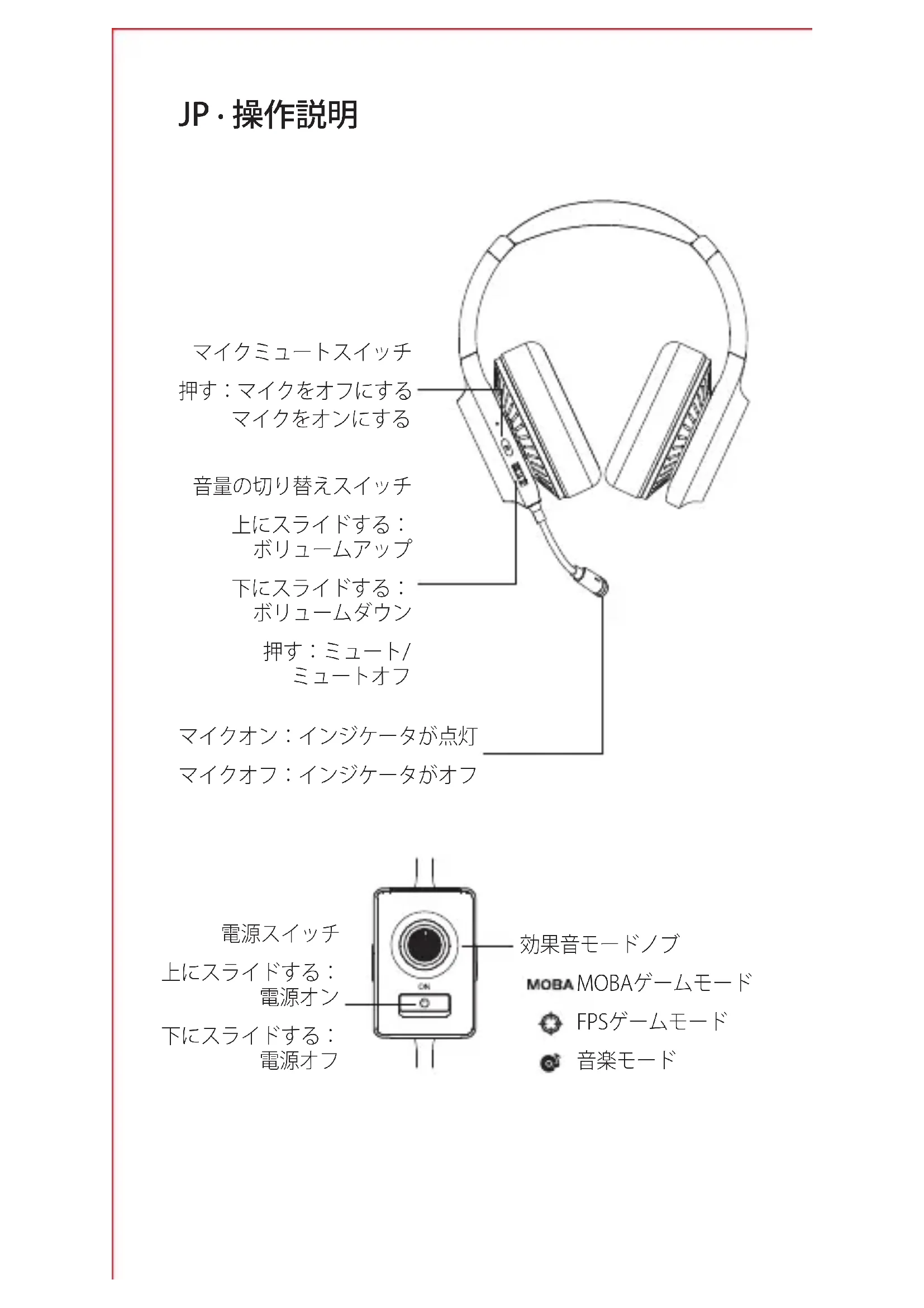 JP·操作説明■ 効果音調整ソフトウェアのインストール 1.EDIFIERホームページWebサイト(www.edifier.com)にログイ ンして、G7のソフトウェアをダウンロードし、「setup.exe」 ファイルを見つけ、EDIFIERソフトウェアをインストールしてく ださい(Windows7、Windows8、Windows8.1および Windows10システムはサポート済み)。 2.インストールを完了するためには説明の指示に従ってください。 ノイズキャンセルスイッチ 押す:ノイズキャンセルのオン/オフの切り替え (ソフトウェアがインストールされていない場合