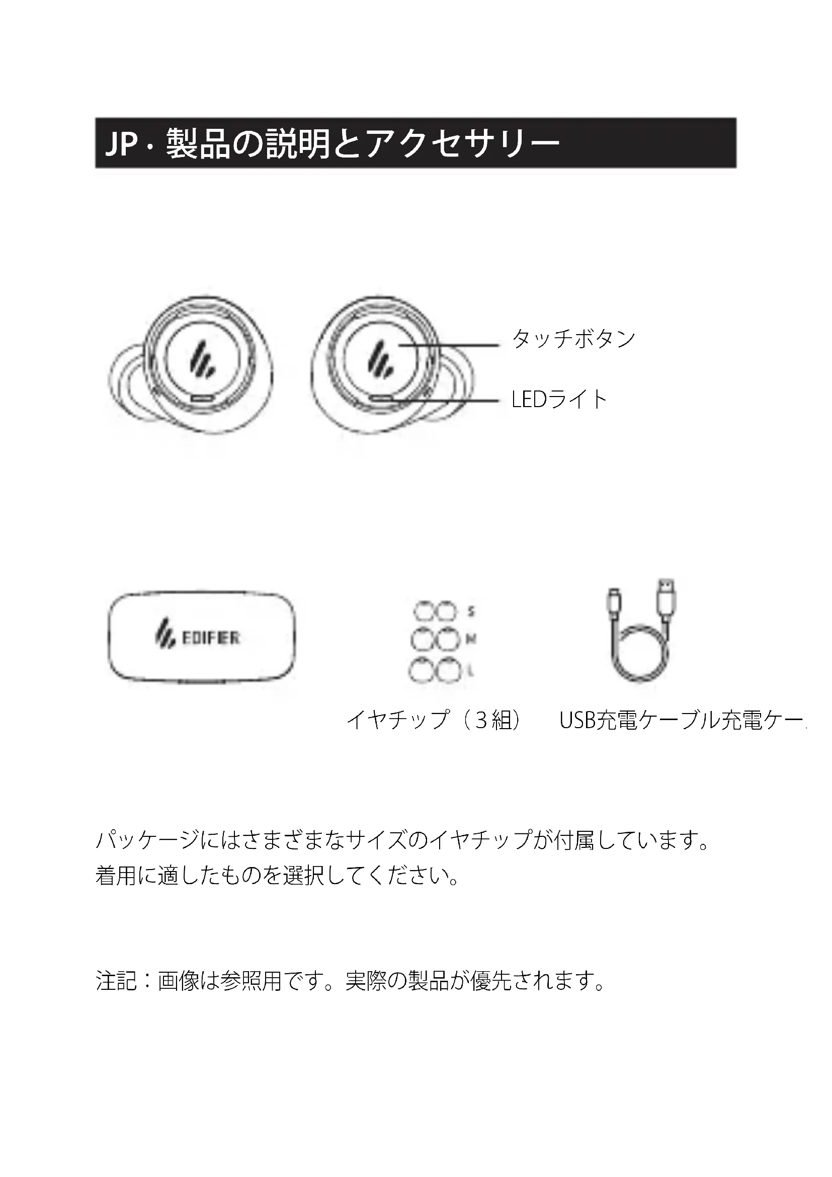 本書に記載の情報は、技術の改良、システムのアップグレードなどの ため、予告なく変更されることがあります。 EDIFIERの製品は、さまざまな用途を考慮してカスタマイズされます。 本書の図や写真は実際の製品と異なることがあります。その場合、 実際の製品設計が優先します。