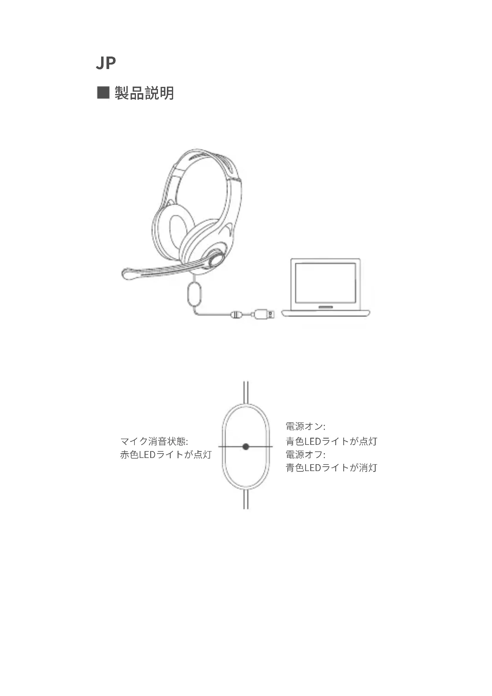 電源オン: ヘッドセットのUSB-Aプラグをコンピューターに差し込んでください。 ヘッドセットが使用できるようになり、青色LEDライトが点灯します。これで、 オーディオを再生または入力できます。 電源オフ: コンピューターからUSB-Aを抜くと、LEDライトはオフになります。 消音: コンピューターから消音状態に切り替えると、マイクはオフになり、赤 色LEDライトが点灯します。 音量調節: ヘッドセットとマイク音量は、コンピューターから調節してください。• 製品は、内部回路を影響しないため、湿気の高いところを避け、 乾燥した状態で保存してください。激しい運動をする時や多量の 汗をかく時には製品を使用しないでください。