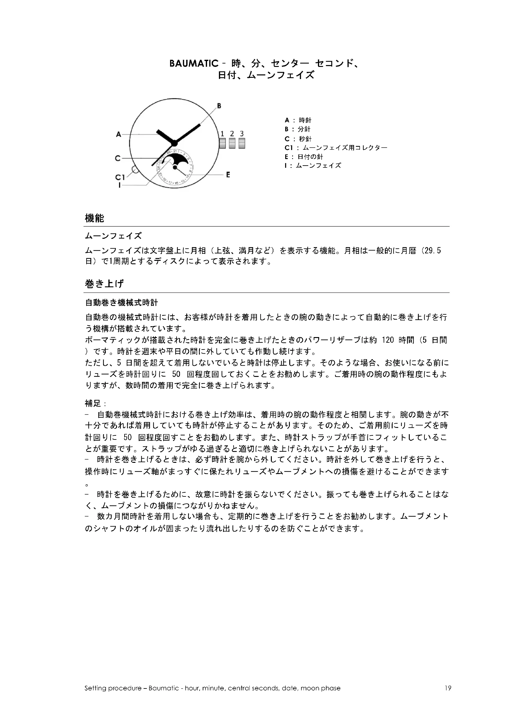 - 時計を巻き上げるために、故意に時計を振らないでください。振っても巻き上げられることはな く、ムーブメントの損傷につながりかねません。 - 数カ月間時計を着用しない場合も、定期的に巻き上げを行うことをお勧めします。ムーブメント のシャフトのオイルが固まったり流れ出したりするのを防ぐことができます。Setting procedure – Baumatic - hour, minute, central seconds, date, moon phase 20