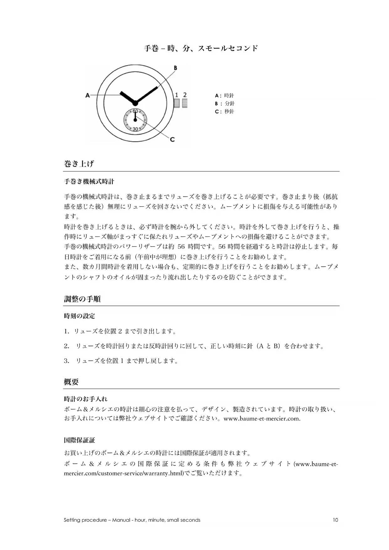 お買い上げのボーム&メルシエの時計には国際保証が適用されます。 ボーム& メルシエの国際保証に定める条件も弊社ウェブサイト(www.baume-et- mercier.com/customer-service/warranty.html)でご覧いただけます。Setting procedure – Manual - hour, minute, small seconds 11 その他のインフォメーション あらゆる疑問点については、当社ウェブサイト www.baume-et-mercier.com をご覧ください。 また、お住まいの国の正規販売店(当社ウェブサイト www.baume-et-mercier.com にリストを載せてお ります)にお問い合わせいただけるほか、当社ウェブサイトのお問い合わせフォームを使用してこちら に直接、お問い合わせいただくか、あるいはカスタマーサービスセンター(www.baume-et- mercier.com/customer-service/contact-us.html)にお電話にてご連絡いただけることも可能です。Setting procedure – Manual - hour, minute, small seconds 12