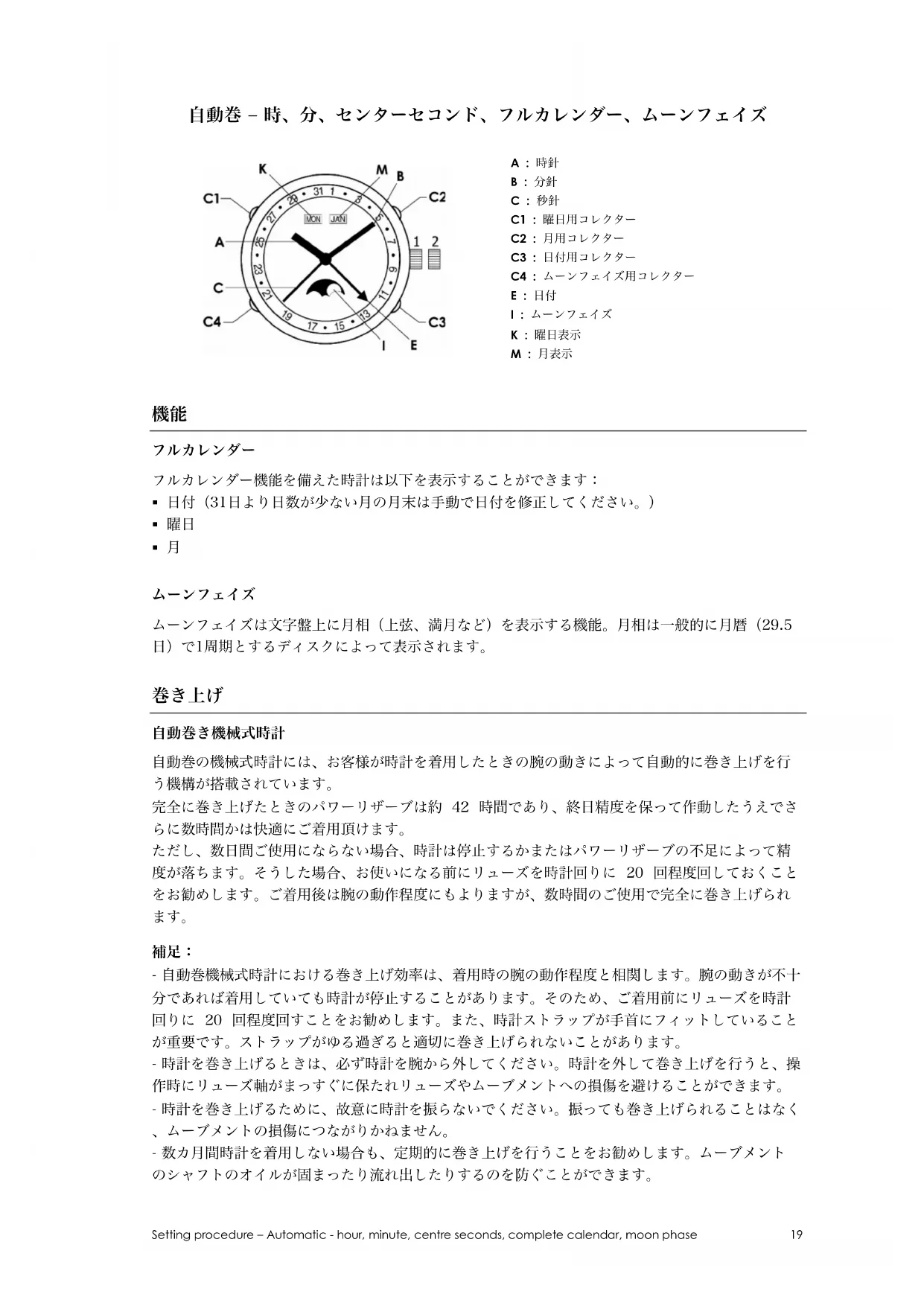 - 自動巻機械式時計における巻き上げ効率は、着用時の腕の動作程度と相関します。腕の動きが不十 分であれば着用していても時計が停止することがあります。そのため、ご着用前にリューズを時計 回りに 20 回程度回すことをお勧めします。また、時計ストラップが手首にフィットしていること が重要です。ストラップがゆる過ぎると適切に巻き上げられないことがあります。 - 時計を巻き上げるときは、必ず時計を腕から外してください。時計を外して巻き上げを行うと、操 作時にリューズ軸がまっすぐに保たれリューズやムーブメントへの損傷を避けることができます。 - 時計を巻き上げるために、故意に時計を振らないでください。振っても巻き上げられることはなく 、ムーブメントの損傷につながりかねません。 - 数カ月間時計を着用しない場合も、定期的に巻き上げを行うことをお勧めします。ムーブメント のシャフトのオイルが固まったり流れ出したりするのを防ぐことができます。Setting procedure – Automatic - hour, minute, centre seconds, complete calendar, moon phase 20