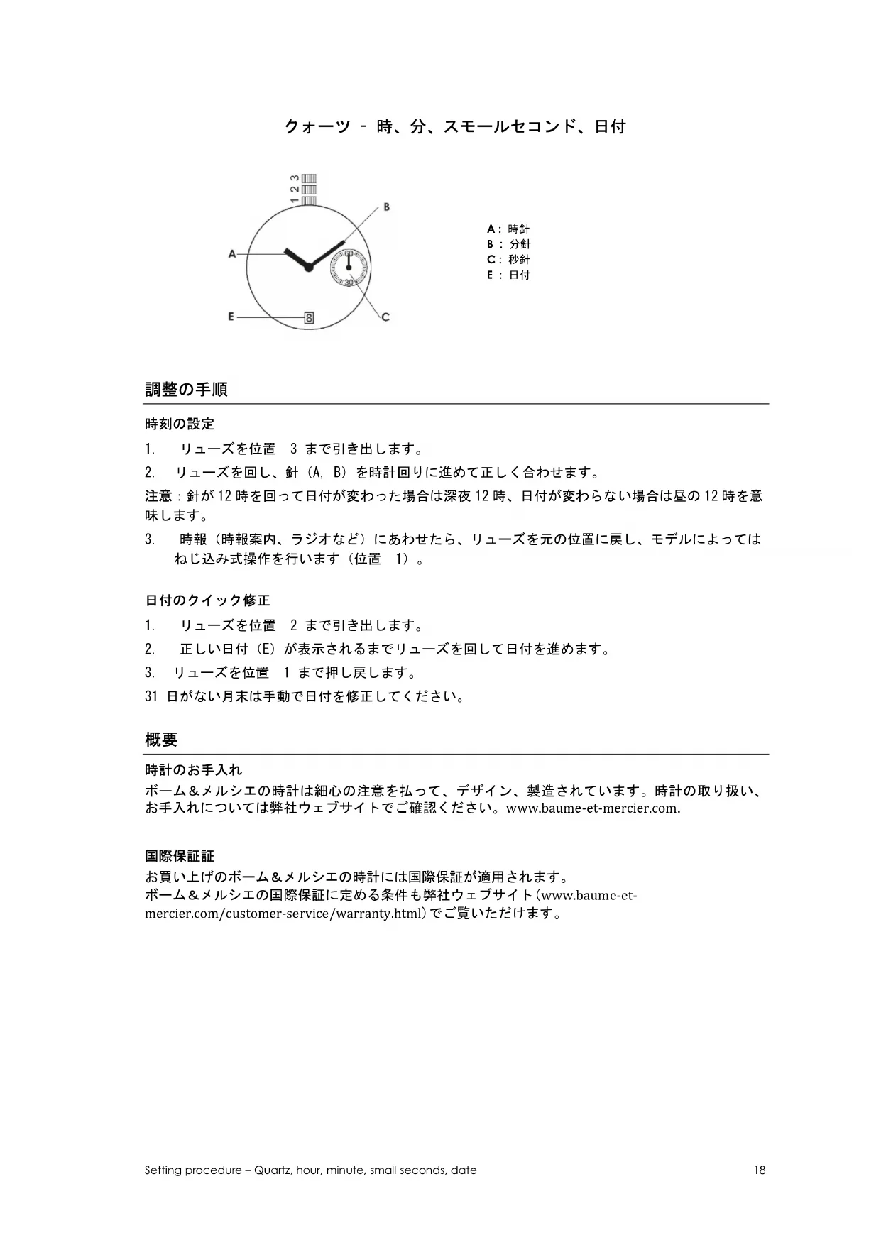 お買い上げのボーム&メルシエの時計には国際保証が適用されます。 ボーム&メルシエの国際保証に定める条件も弊社ウェブサイト(www.baume-et- mercier.com/customer-service/warranty.html)でご覧いただけます。Setting procedure – Quartz, hour, minute, small seconds, date 19 寿命がきたクォーツ時計のリサイクルと取扱について*