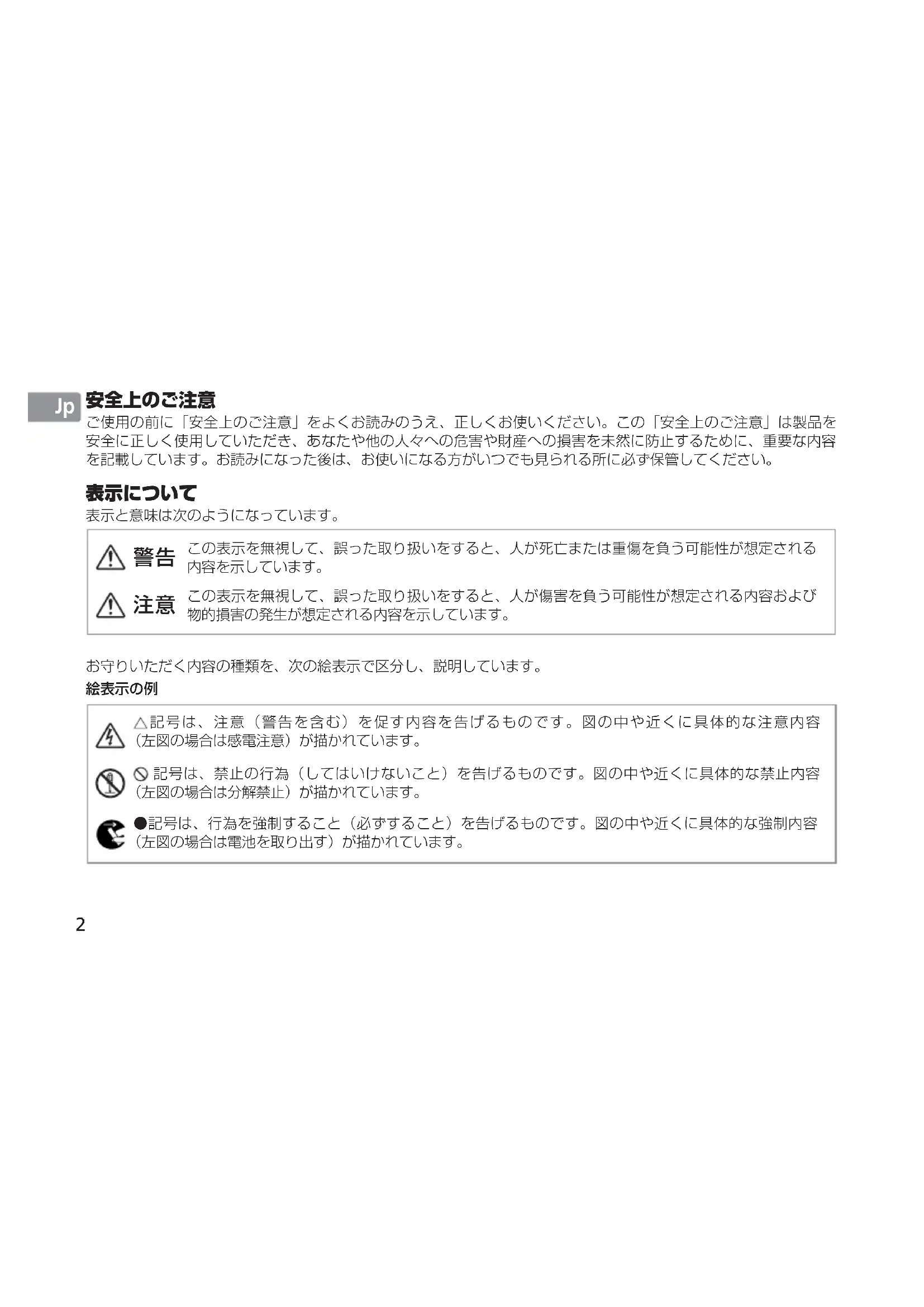 記号は、注意(警告を含む)を促す内容を告げるものです。図の中や近くに具体的な注意内容 (左図の場合は感電注意)が描かれています。 記号は、禁止の行為(してはいけないこと)を告げるものです。図の中や近くに具体的な禁止内容 (左図の場合は分解禁止)が描かれています。 ●記号は、行為を強制すること(必ずすること)を告げるものです。図の中や近くに具体的な強制内容 (左図の場合は電池を取り出す)が描かれています。3