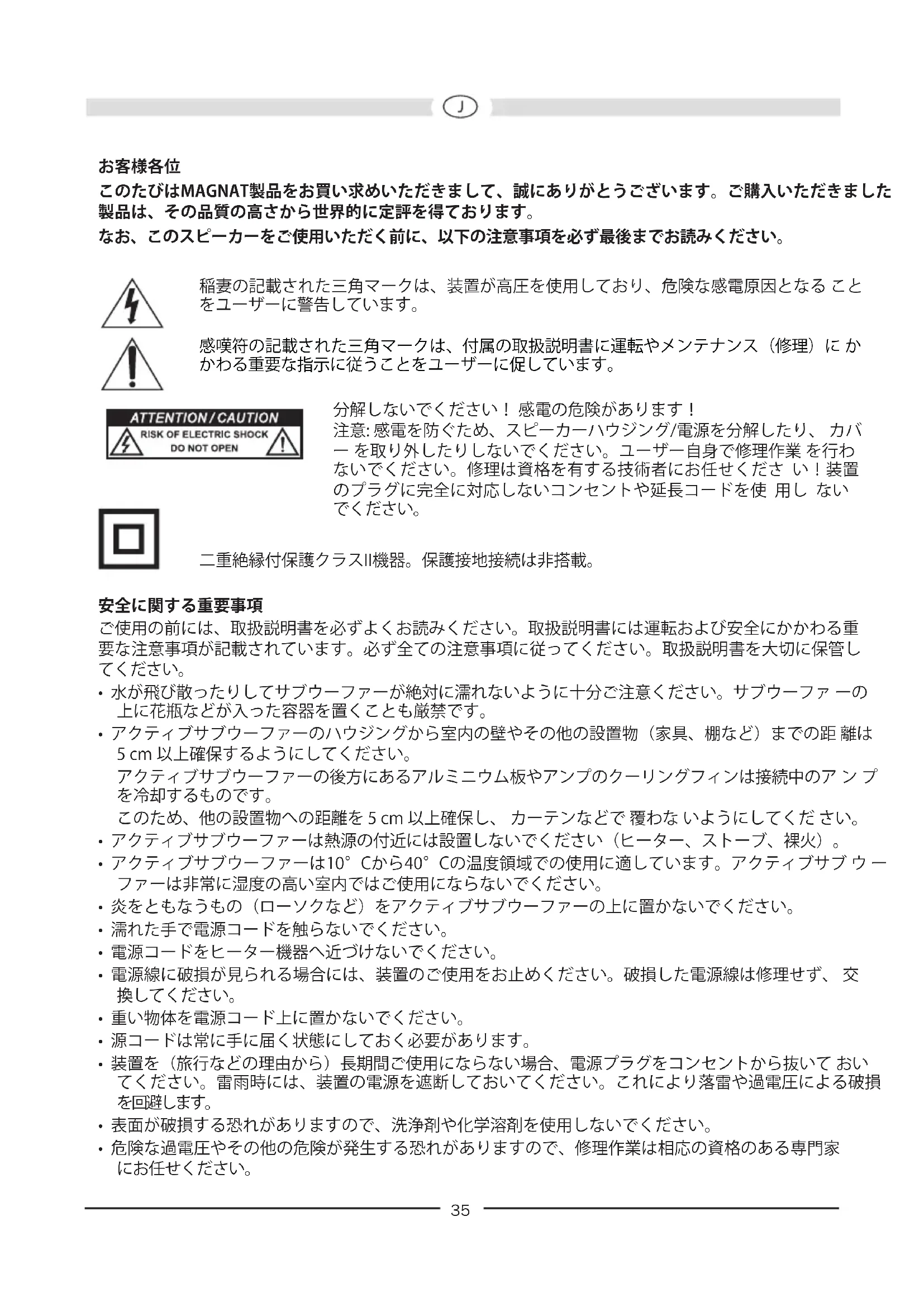 このたびはMAGNAT製品をお買い求めいただきまして、誠にありがとうございます。ご購入いただきました 製品は、その品質の高さから世界的に定評を得ております。 なお、このスピーカーをご使用いただく前に、以下の注意事項を必ず最後までお読みください。 稲妻の記載された三角マークは、装置が高圧を使用しており、危険な感電原因となる こと をユーザーに警告しています。 感嘆符の記載された三角マークは、付属の取扱説明書に運転やメンテナンス(修理)に か かわる重要な指示に従うことをユーザーに促しています。 分解しないでください! 感電の危険があります! 注意: 感電を防ぐため、スピーカーハウジング/電源を分解したり、 カバ ー を取り外したりしないでください。ユーザー自身で修理作業 を行わ ないでください。修理は資格を有する技術者にお任せくださ い!装置 のプラグに完全に対応しないコンセントや延長コードを使 用し ない