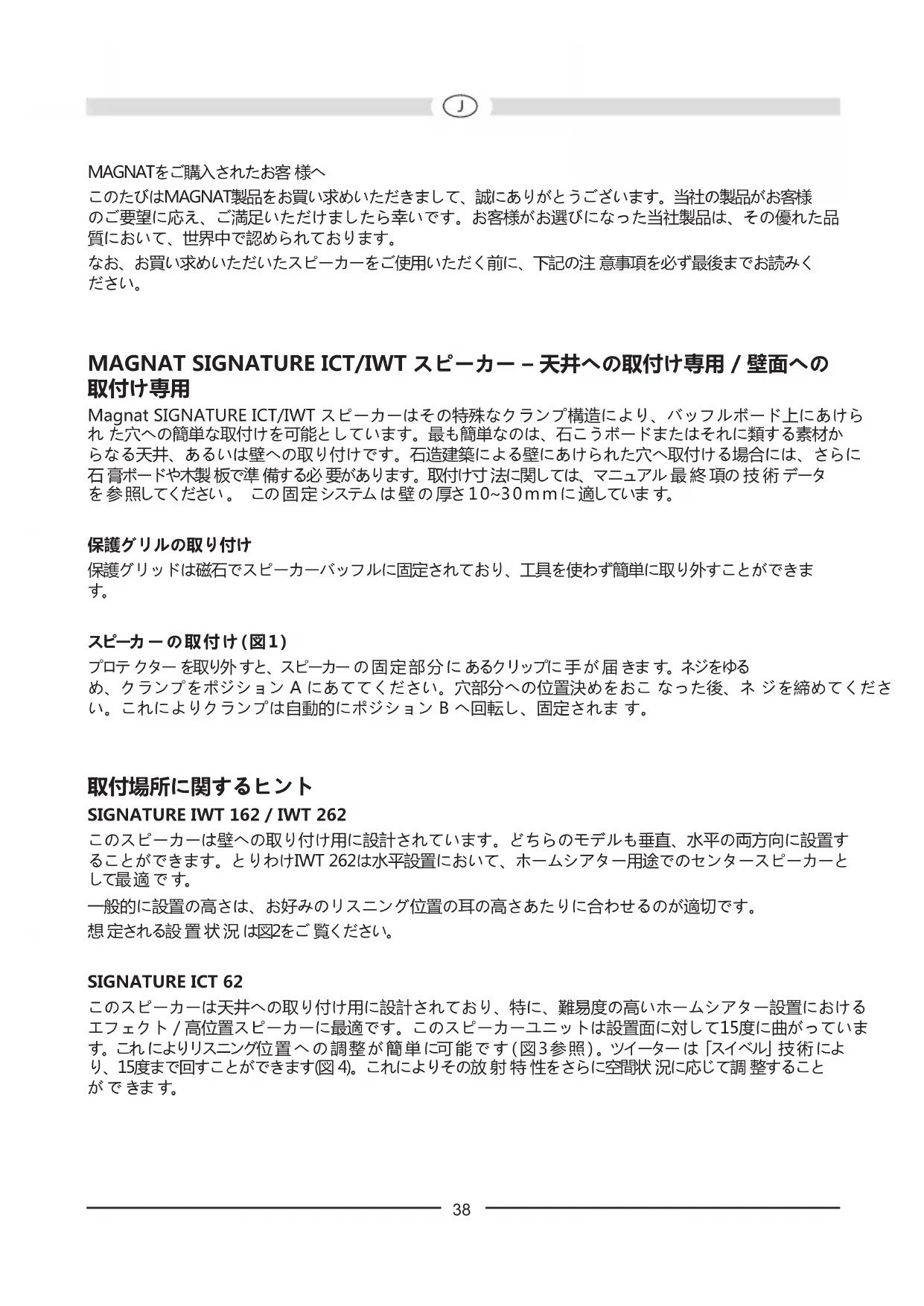 一般的に設置の高さは、お好みのリスニング位置の耳の高さあたりに合わせるのが適切です。 想 定される設 置 状 況 は図2をご 覧ください。 SIGNATURE ICT 62 このスピーカーは天井への取り付け用に設計されており、特に、難易度の高いホームシアター設置における エフェクト/高位置スピーカーに最適です。このスピーカーユニットは設置面に対して15度に曲がっていま す。これ によりリスニング位 置 へ の 調 整 が 簡 単 に可 能 で す(図 3 参 照)。ツイーター は「スイベル」技 術 によ り、15度まで回すことができます(図 4)。これによりその放 射 特 性をさらに空間状 況に応じて調 整すること が で きま す。39 MAGNATスピーカーの接続に関する一般的なご注意 スピーカーを接 続するためには、専門店でお買い求めになれる特別なスピーカーコードが必 要です。音質 が 落ちないように 、長さが 3メートルまでのコードは 、断 面 が最 低 1 mm²、それ以上の場合は直径が最低1.5 mm² のコードを用いることをお勧めします。 アンプやレシーバーは、すべての接続作業が終了するまで、スイッチを切っておいてください。正確なコード の長さを測ることができるように、スピーカーは予定された位置に配置しておきます。両方のチャンネルに 使用するコードは、どちらも同じ長さにしてください。 ここで、コードの先 端を約10~15mm絶縁し、先端をよじってください。スピーカーコネクターはクランプ構 造となっています(図5)。クランプのヘッド部分を押し、むきだしとなっているメッキ先 端を側面の穴へ差し 込んでください。クランプのヘッド部分から手を放すとケーブルが固定され、確実な端 子接続がおこなわれ