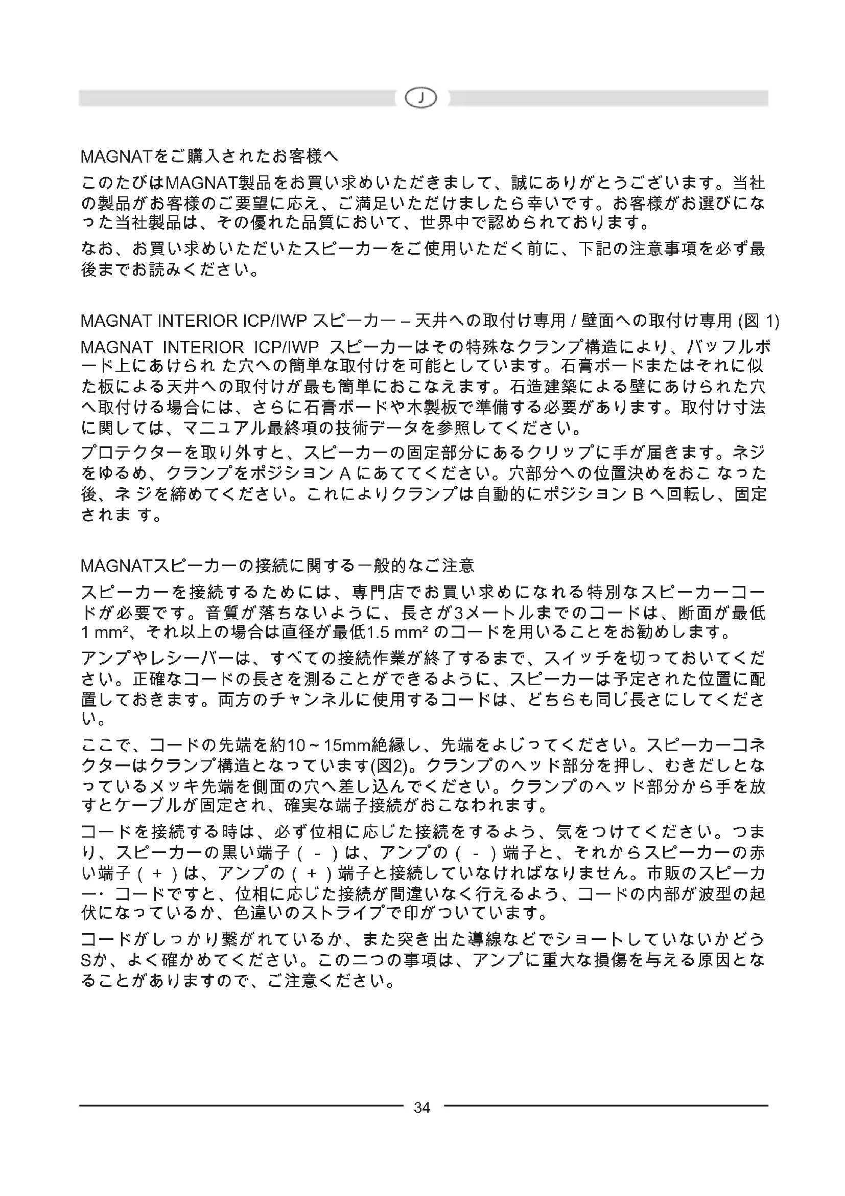 33MAGNATをご購入されたお客様へ このたびはMAGNAT製品をお買い求めいただきまして、誠にありがとうございます。当社 の製品がお客様のご要望に応え、ご満足いただけましたら幸いです。お客様がお選びにな った当社製品は、その優れた品質において、世界中で認められております。 なお、お買い求めいただいたスピーカーをご使用いただく前に、下記の注意事項を必ず最 後までお読みください。 MAGNAT INTERIOR ICP/IWP スピーカー – 天井への取付け専用 / 壁面への取付け専用 (図 1)