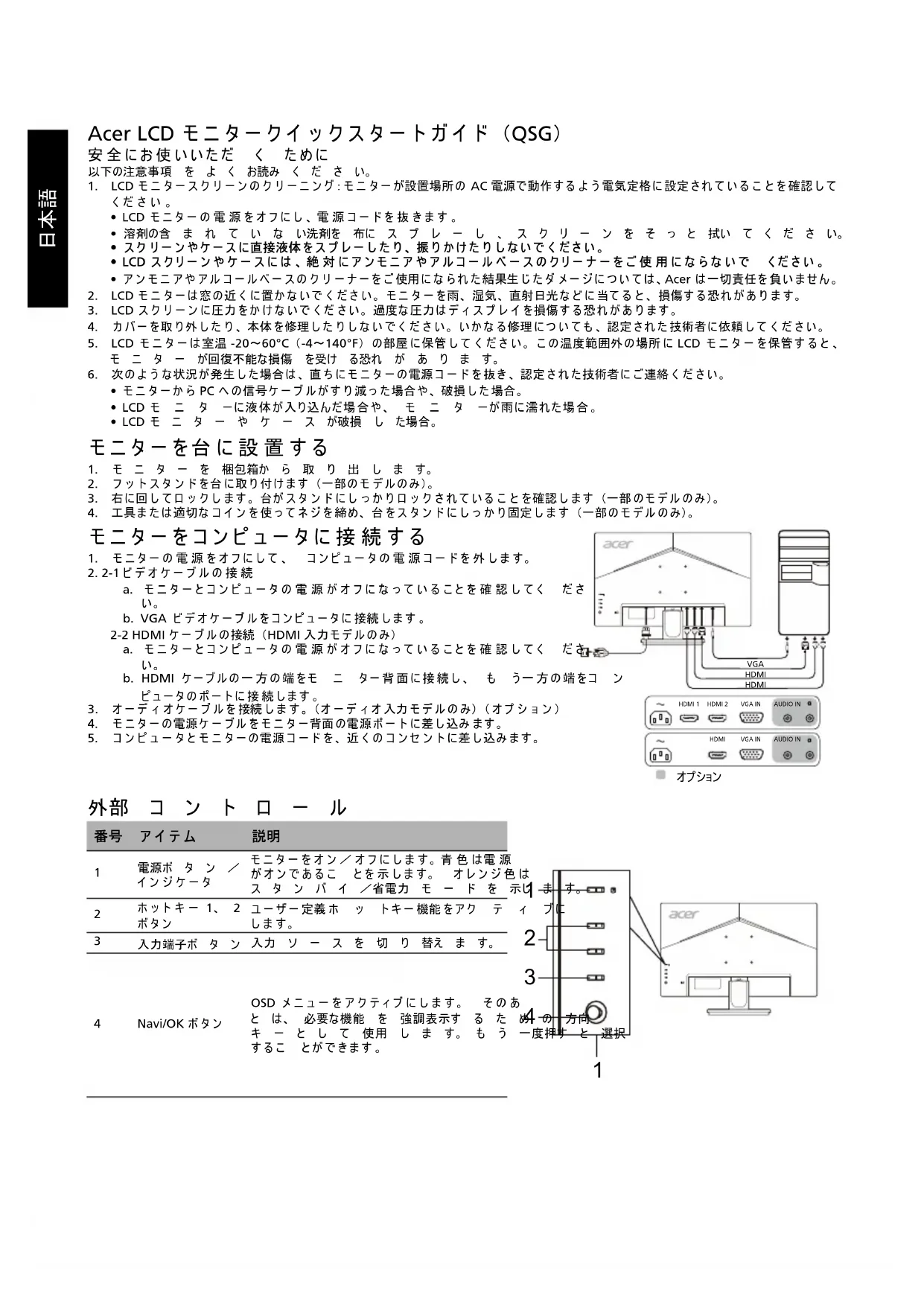 Remarque à l'intention des utilisateurs canadiens Cet appareil numérique de la classe B est conforme à la norme NMB-003 du Canada. 《废弃电器电子产品回收处理管理条例》提示性说明 为了更好地关爱及保护地球,当用户不再需要此产品或产品寿命终止时,请遵守国家废弃电器电子产品回收处理相关法律法规,将其交给 当地具有国家认可的回收处理资质的厂商进行回收处理。 欧盟私人家庭用户废旧设备弃置 产品或其包装上的此标志表示不得将此产品与其他生活垃圾一起弃置。反之,您有责任将废旧设备送往指定的废旧电器和 电子设备回收收集点。弃置废旧设备时进行分类收集和回收有助于节约自然资源并确保将其以保护人类健康和环境的方式 回收再利用。有关弃置废旧设备回收站的详细信息,请联系当地市政府办公室、生活垃圾处理服务或产品购买处。 在官方的 Acer 支持网站上查找 Acer 产品的手册及其它文档。 管制认证简体中文日本語 Acer LCD モニタークイックスタートガイド (QSG) 安全にお使いいただ く ために 以下の注意事項 を よ く お読み く だ さ い。