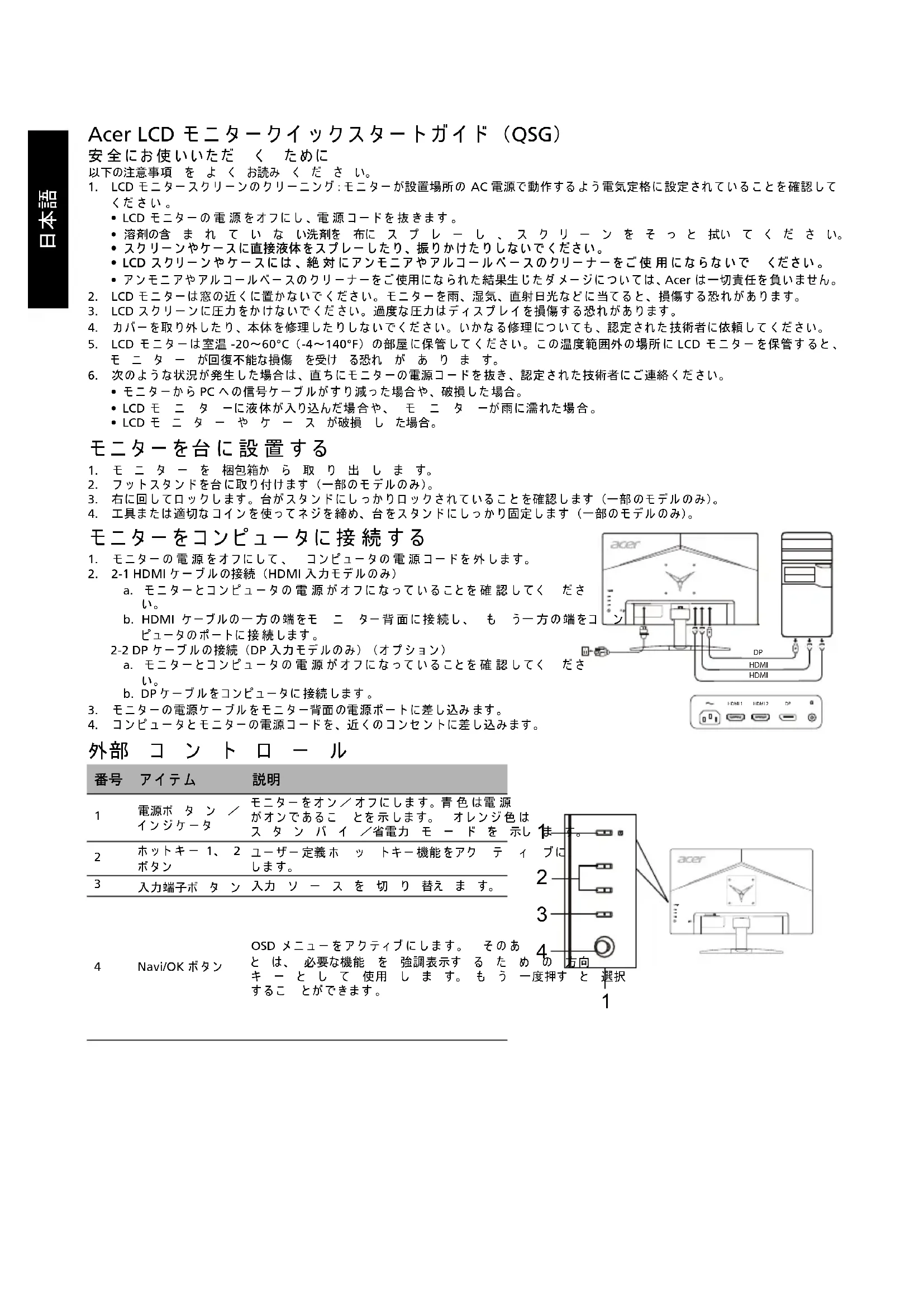 Remarque à l'intention des utilisateurs canadiens Cet appareil numérique de la classe B est conforme à la norme NMB-003 du Canada. 《废弃电器电子产品回收处理管理条例》提示性说明 为了更好地关爱及保护地球,当用户不再需要此产品或产品寿命终止时,请遵守国家废弃电器电子产品回收处理相关法律法规,将其交给 当地具有国家认可的回收处理资质的厂商进行回收处理。 欧盟私人家庭用户废旧设备弃置 产品或其包装上的此标志表示不得将此产品与其他生活垃圾一起弃置。反之,您有责任将废旧设备送往指定的废旧电器和 电子设备回收收集点。弃置废旧设备时进行分类收集和回收有助于节约自然资源并确保将其以保护人类健康和环境的方式 回收再利用。有关弃置废旧设备回收站的详细信息,请联系当地市政府办公室、生活垃圾处理服务或产品购买处。 在官方的 Acer 支持网站上查找 Acer 产品的手册及其它文档。 管制认证简体中文日本語 Acer LCD モニタークイックスタートガイド (QSG) 安全にお使いいただ く ために 以下の注意事項 を よ く お読み く だ さ い。