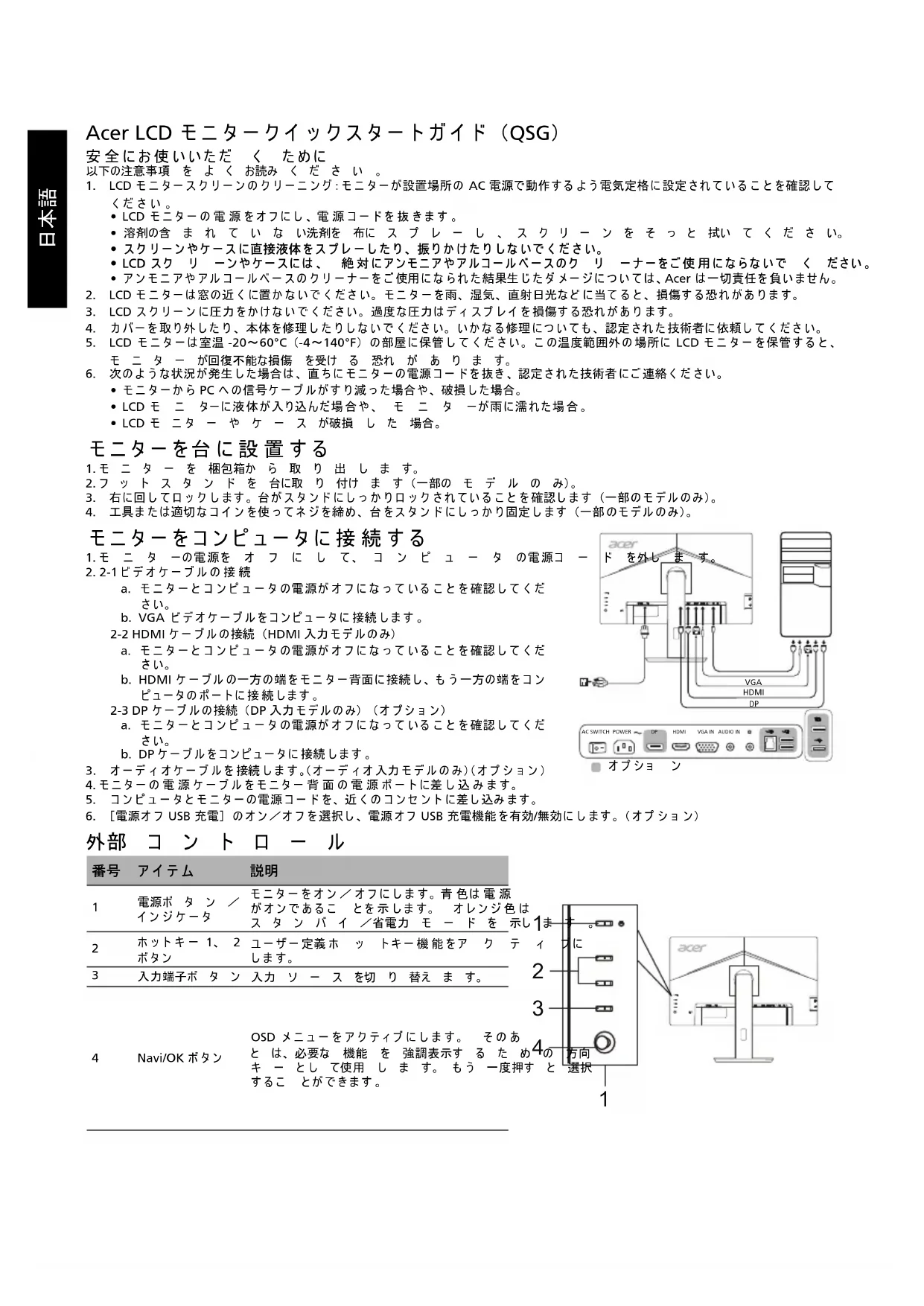 此 B 类数字设备符合加拿大 ICES-003 标准。 Remarque à l'intention des utilisateurs canadiens Cet appareil numérique de la classe B est conforme à la norme NMB-003 du Canada. 《废弃电器电子产品回收处理管理条例》提示性说明 为了更好地关爱及保护地球,当用户不再需要此产品或产品寿命终止时,请遵守国家废弃电器电子产品回收处理相关法律法规,将其交给 当地具有国家认可的回收处理资质的厂商进行回收处理。 欧盟私人家庭用户废旧设备弃置 产品或其包装上的此标志表示不得将此产品与其他生活垃圾一起弃置。反之,您有责任将废旧设备送往指定的废旧电器和 电子设备回收收集点。弃置废旧设备时进行分类收集和回收有助于节约自然资源并确保将其以保护人类健康和环境的方式 回收再利用。有关弃置废旧设备回收站的详细信息,请联系当地市政府办公室、生活垃圾处理服务或产品购买处。 在官方的 Acer 支持网站上查找 Acer 产品的手册及其它文档。 管制认证简体中文日本語 Acer LCD モニタークイックスタートガイド (QSG) 安全にお使いいただ く ために 以下の注意事項 を よ く お読み く だ さ い 。