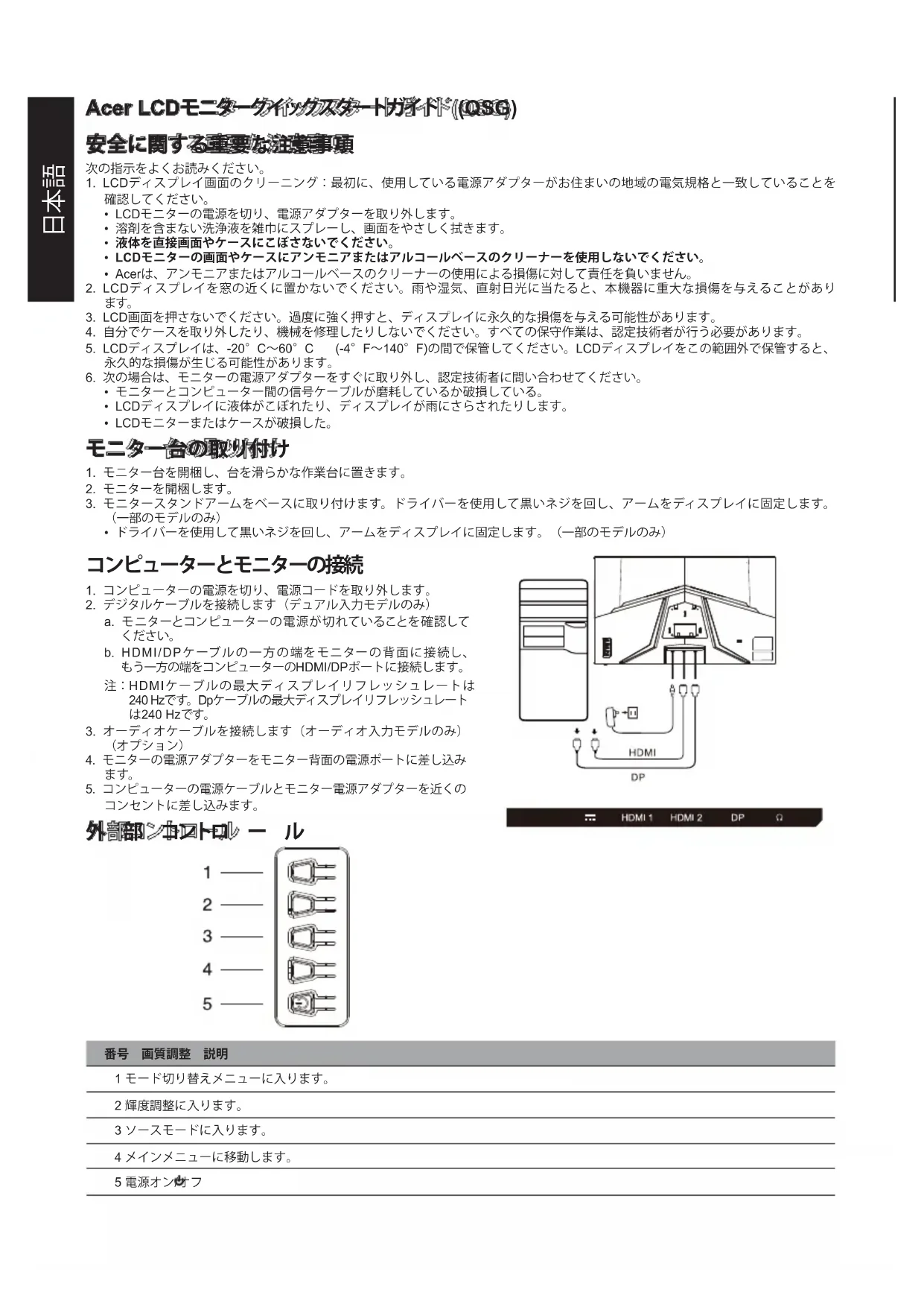 240Hz; 240Hz;简体中文简体中文简体中文日本語 Acer LCDモニタークイックスタートガイド (QSG) 安全に関する重要な注意事項 次の指示をよくお読みください。
