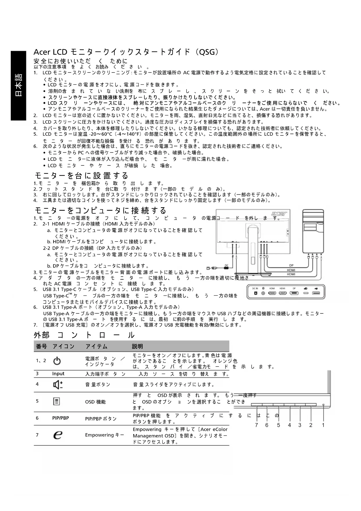 Magnet简体中文日本語 Acer LCD モニタークイックスタートガイド (QSG) 安全にお使いいただ く ために 以下の注意事項 を よ く お読み く だ さ い 。