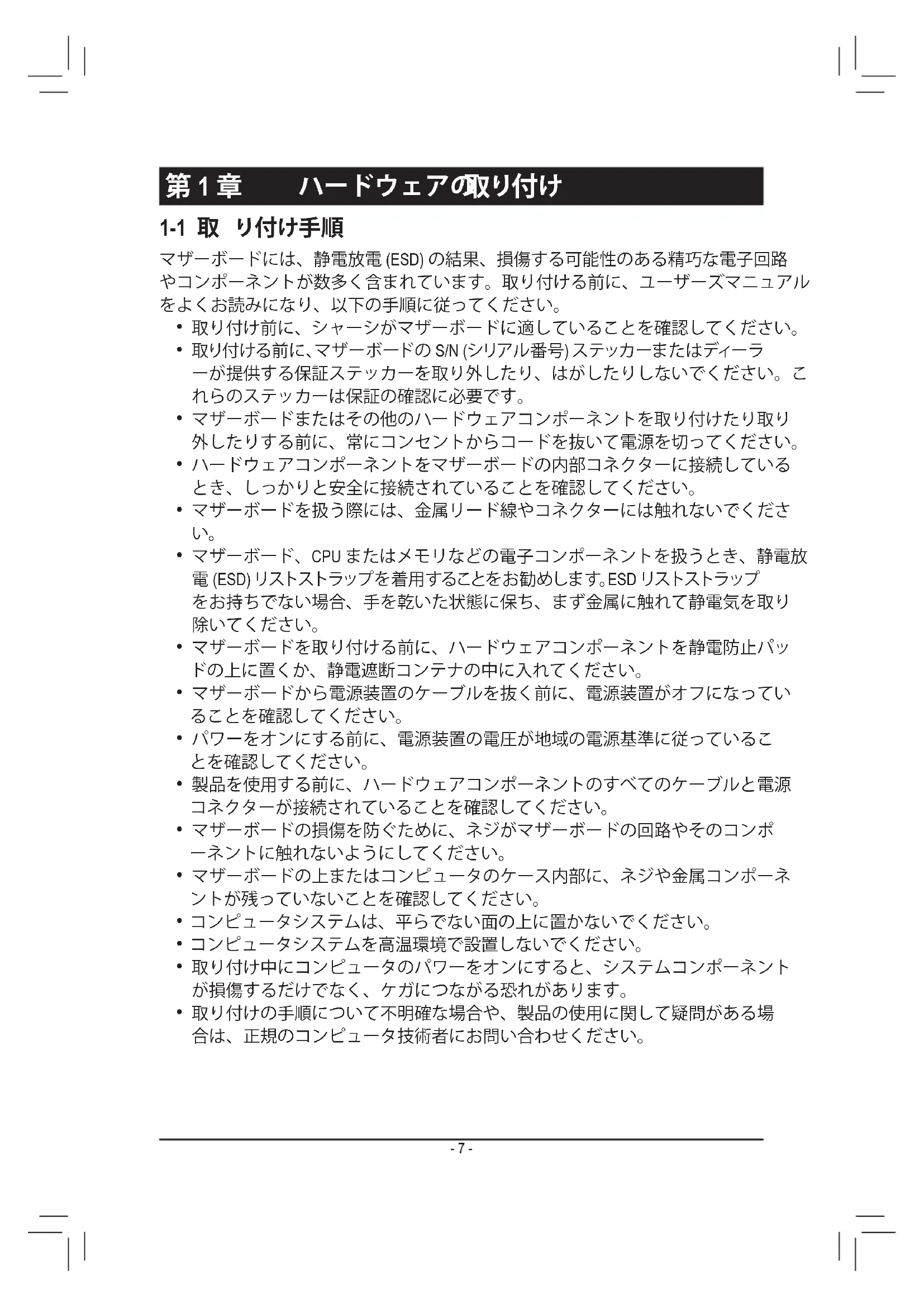 マザーボードには、静電放電 (ESD) の結果、損傷する可能性のある精巧な電子回路 やコンポーネントが数多く含まれています。取り付ける前に、ユーザーズマニュアル をよくお読みになり、以下の手順に従ってください。