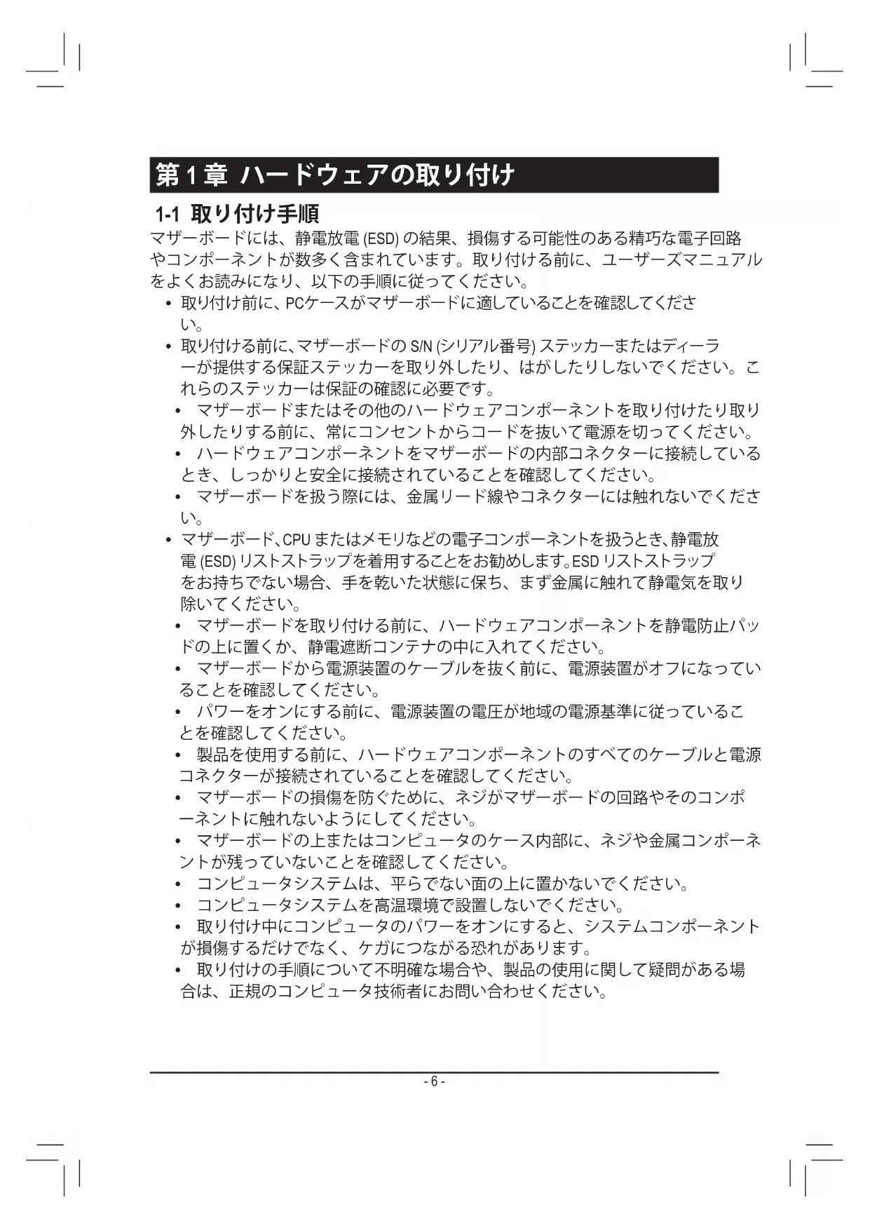 Center/Subwoofer Speaker Out Line Out MIC Line In S/PDIF Out Side Speaker Out Rear Speaker Out CODEC S/PDIF In Dual BIOS- 6 - 第 1 章 ハードウェアの取り付け 1-1 取り付け手順 マザーボードには、静電放電 (ESD) の結果、損傷する可能性のある精巧な電子回路 やコンポーネントが数多く含まれています。取り付ける前に、ユーザーズマニュアル をよくお読みになり、以下の手順に従ってください。