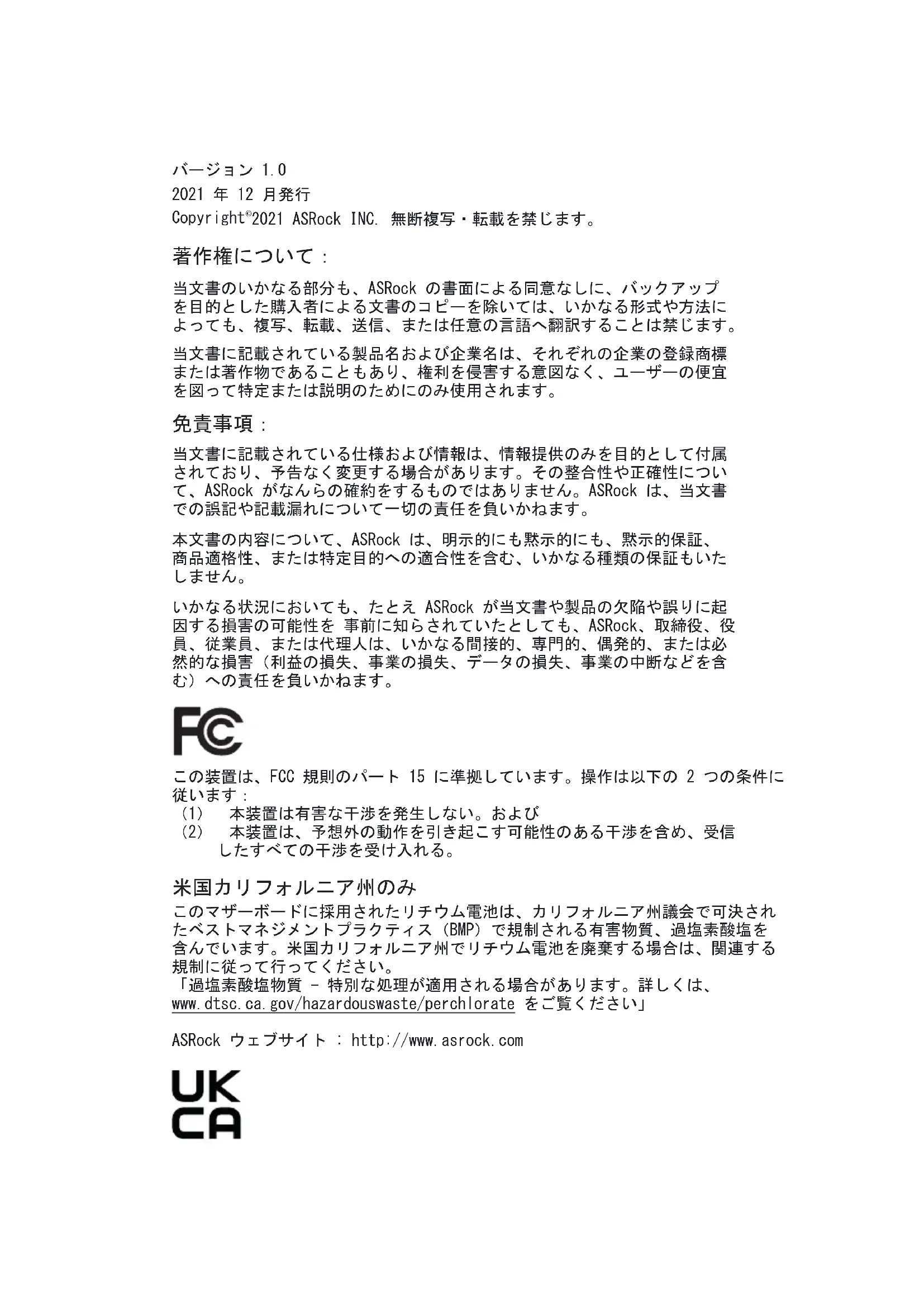 いかなる状況においても、たとえ ASRock が当文書や製品の欠陥や誤りに起 因する損害の可能性を 事前に知らされていたとしても、ASRock、取締役、役 員、従業員、または代理人は、いかなる間接的、専門的、偶発的、または必 然的な損害(利益の損失、事業の損失、データの損失、事業の中断などを含 む)への責任を負いかねます。 この装置は、FCC 規則のパート 15 に準拠しています。操作は以下の 2 つの条件に