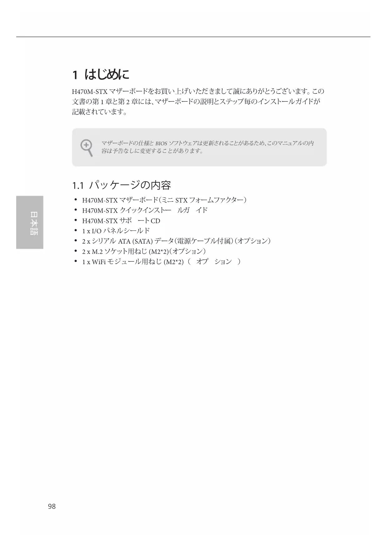 1 はじめに H470M-STX マザーボードをお買い上げいただきまして誠にありがとうございます。 この 文書の第 1 章と第 2 章には、マザーボードの説明とステップ毎のインストールガイドが
