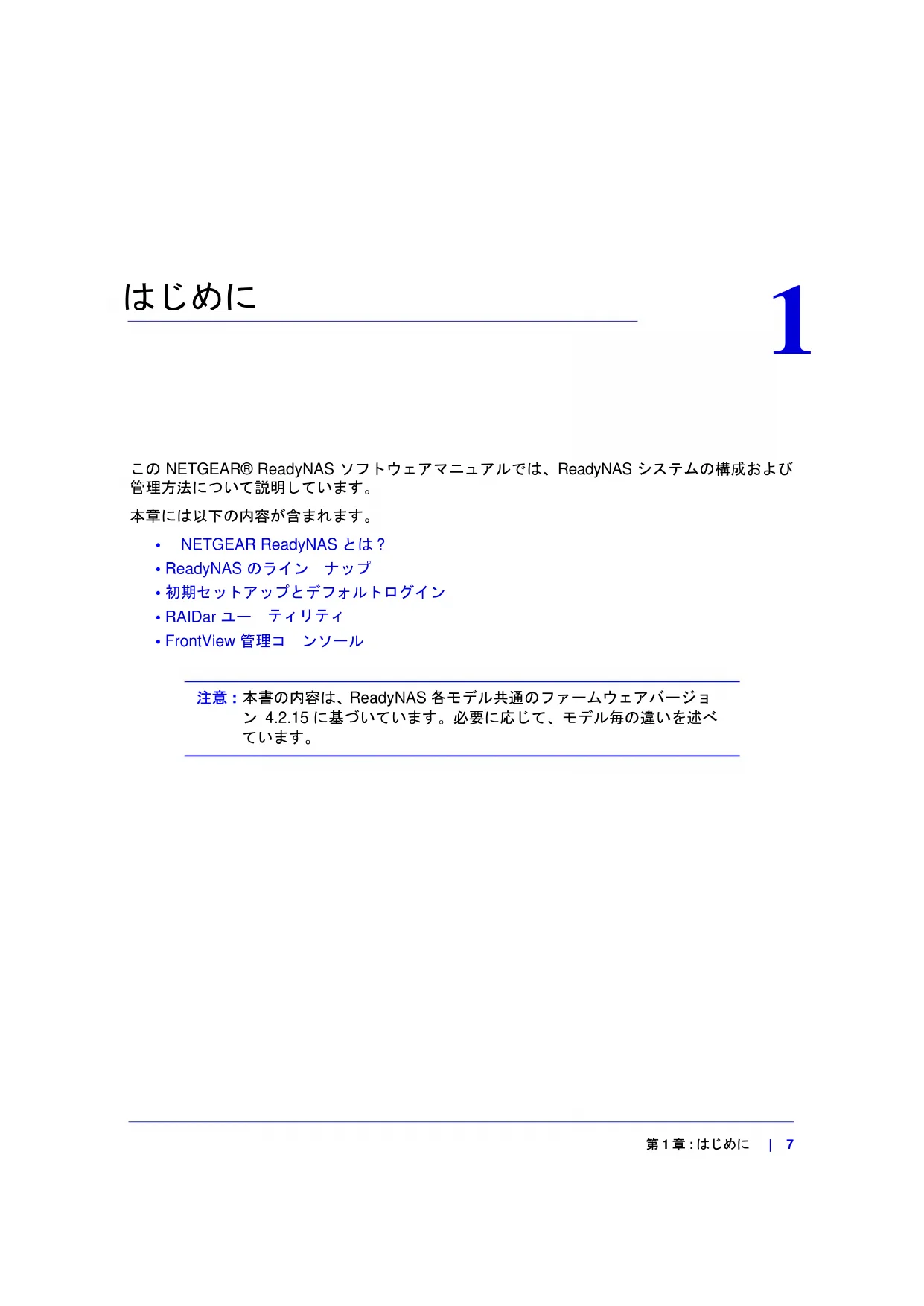注意 : 本書の内容は、ReadyNAS 各モデル共通のファームウェアバージョ ン 4.2.15 に基づいています。必要に応じて、モデル毎の違いを述べ ています。8 | 第 1 章 : はじめに ReadyNAS ソフトウェアマニュアル NETGEAR ReadyNAS とは ? NETGEAR® ReadyNAS ネットワークストレージは、ビジネスユーザやホームユーザにデー タ共有やデータ保護のためのネットワーク接続ストレージ (NAS) ソリューションを提供し
