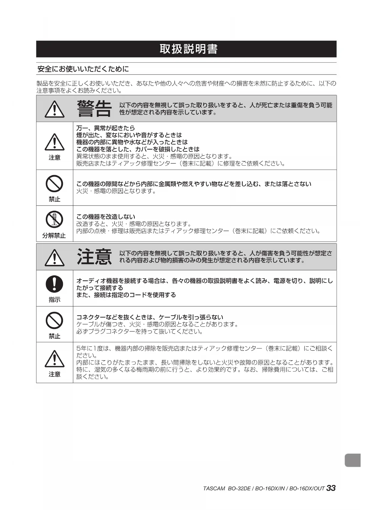 内部にほこりがたまったまま、長い間掃除をしないと火災や故障の原因となることがあります。 特に、湿気の多くなる梅雨期の前に行うと、より効果的です。なお、掃除費用については、ご相 談ください。34 TASCAM BO-32DE / BO-16DX/IN / BO-16DX/OUT このたびは、TASCAM BO-32DE / BO-16DX/IN / BO-16DX/ OUTをお買い上げいただきまして、誠にありがとうございます。 ご使用になる前に、この取扱説明書をよくお読みになり、正しい取 り扱い方法をご理解いただいた上で、末永くご愛用くださいますよ うお願い申し上げます。お読みになったあとは、いつでも見られる 所に保管してください。 また取扱説明書は、TASCAMのウェブサイト(https://tascam. jp/jp/)からダウンロードすることができます。