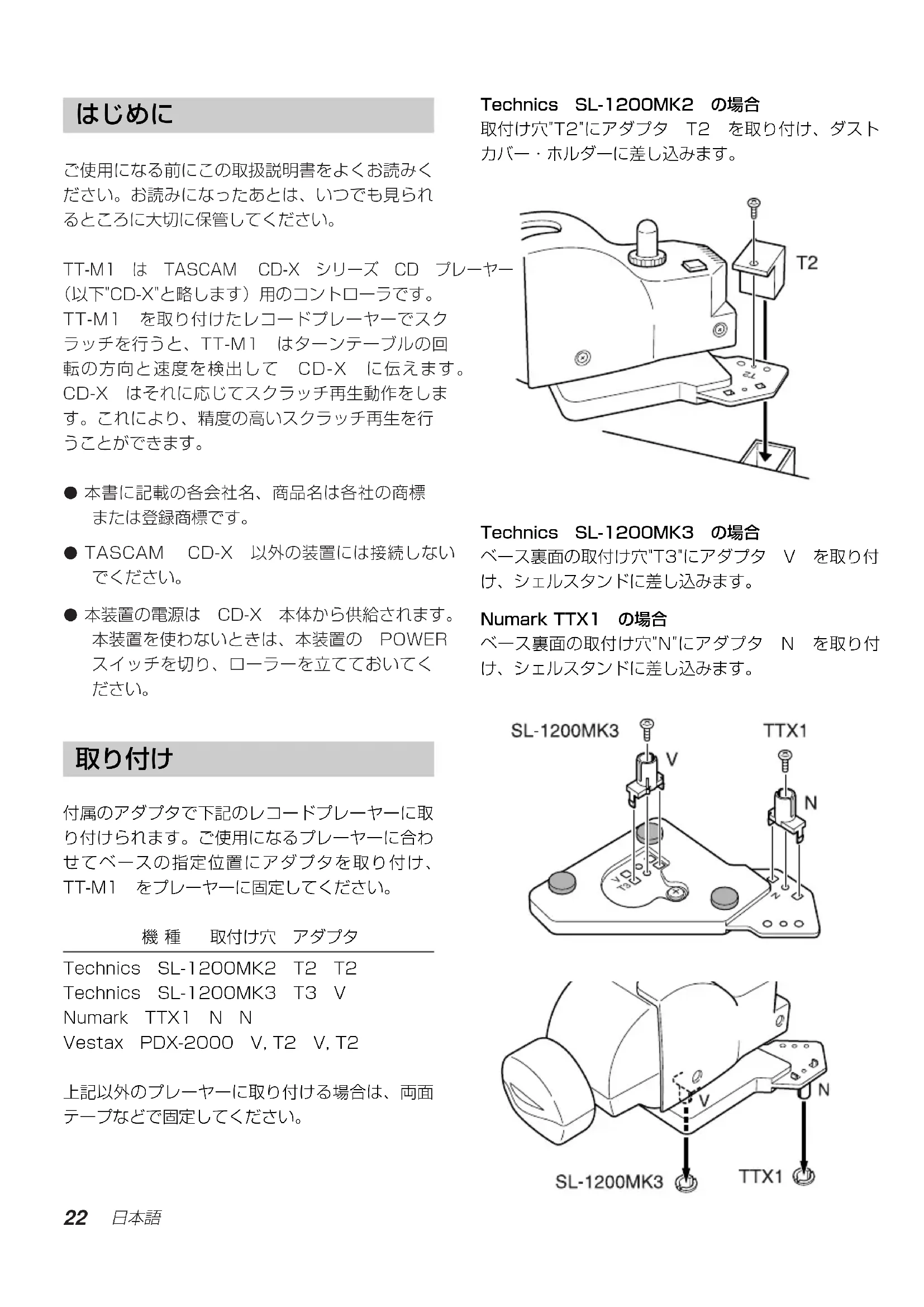 付属のアダプタで下記のレコードプレーヤーに取 り付けられます。ご使用になるプレーヤーに合わ せてベースの指定位置にアダプタを取り付け、 TT-M1 をプレーヤーに固定してください。 機種 取付け穴 アダプタ Technics SL-1200MK2 T2 T2 Technics SL-1200MK3 T3 V Numark TTX1 N N Vestax PDX-2000 V,T2 V,T2 上記以外のプレーヤーに取り付ける場合は、両面 テープなどで固定してください。 Technics SL-1200MK2 の場合 取付け穴"T2"にアダプタ T2 を取り付け、ダスト カバー・ホルダーに差し込みます。 Technics SL-1200MK3 の場合 ベース裏面の取付け穴"T3"にアダプタ V を取り付 け、シェルスタンドに差し込みます。 NumarkTTX1 の場合 ベース裏面の取付け穴"N"にアダプタ N を取り付 け、シェルスタンドに差し込みます。23