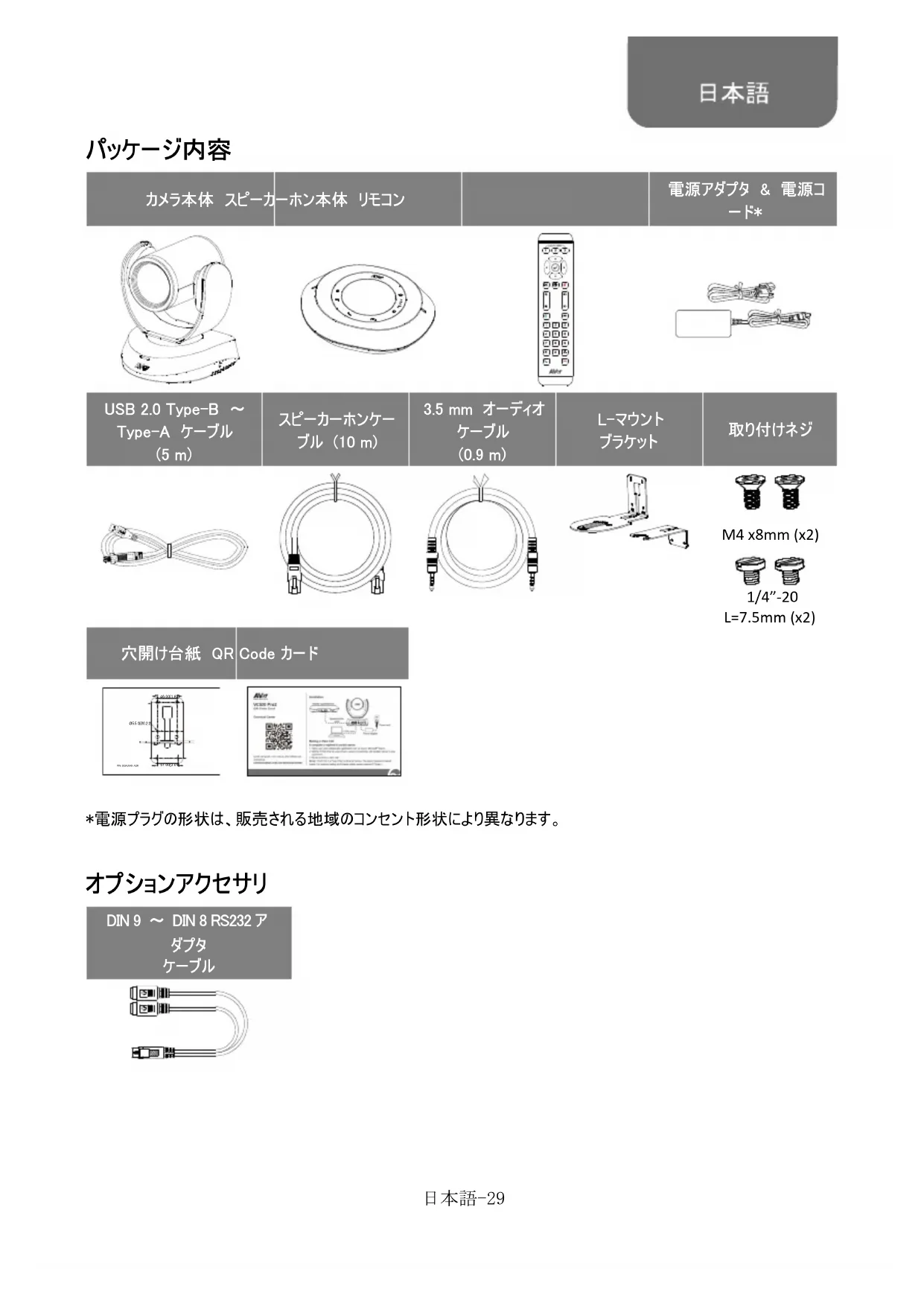 USB・RS232 ケーブルは付属ネジを使用し固定します。 RS232 ケーブルはオプションのアクセサリです。AVer から お買い求めになれます。 ケーブル固前に、各ケーブルがカメラの端子に正しく接 続されていることを確認してください。日本語-32