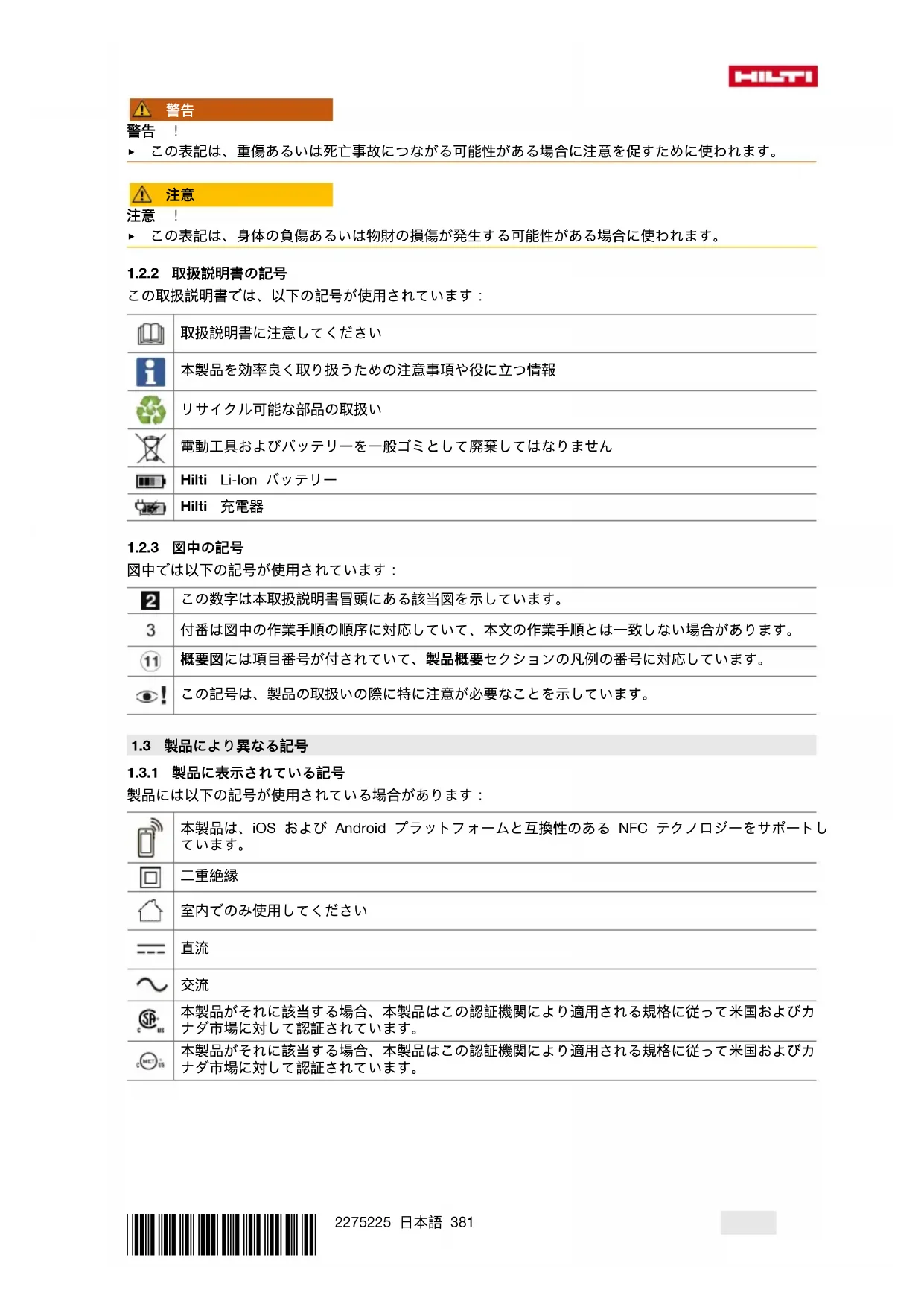 - 手入れおよび保守作業の後は、すべての安全機構を取り付けて機能を点検してください。 安全な作動のために、必ず純正のスペアパーツと消耗品を使用してください。本製品向けに弊社が承 認したスペアパーツ、消耗品およびアクセサリーは、弊社営業担当またはHilti Store にお問い合わせ いただくか、あるいはwww.hilti.group でご確認ください。386 日本語 2275225 *2275225*
