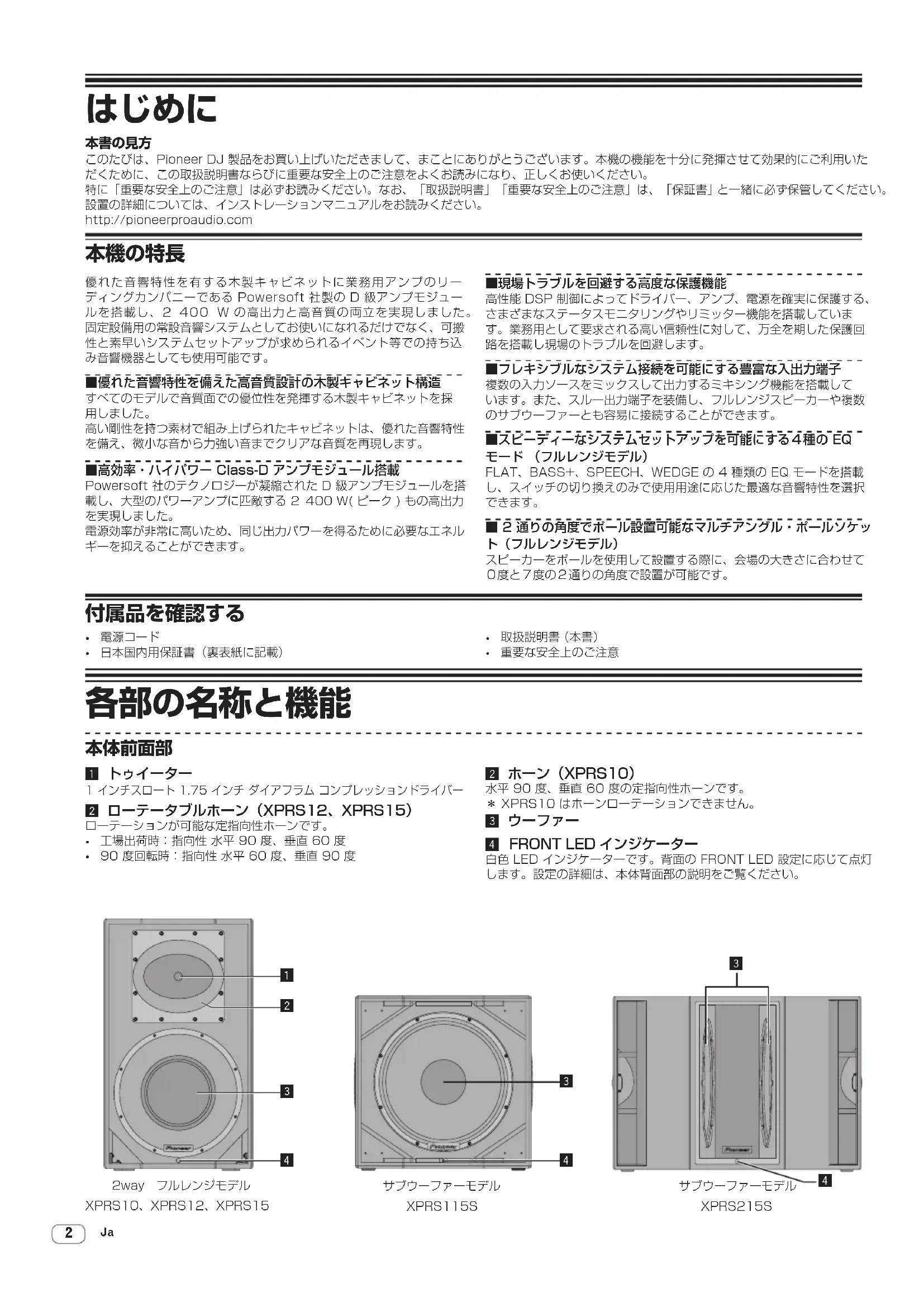 本書の見方このたびは、Pioneer DJ 製品をお買い上げいただきまして、まことにありがとうございます。本機の機能を十分に発揮させて効果的にご利用いただくために、この取扱説明書ならびに重要な安全上のご注意をよくお読みになり、正しくお使いください。特に「重要な安全上のご注意」は必ずお読みください。なお、「取扱説明書」「重要な安全上のご注意」は、「保証書」 と一緒に必ず保管してください。設置の詳細については、インストレーションマニュアルをお読みください。http://pioneerproaudio.com 優れた音響特性を有する木製キャビネットに業務用アンプのリーディングカンパニーである Powersoft 社製の D 級アンプモジュールを搭載し、2400 W の高出力と高音質の両立を実現しました。 固定設備用の常設音響システムとしてお使いになれるだけでなく、可搬性と素早いシステムセットアップが求められるイベント等での持ち込み音響機器としても使用可能です。■優れた音響特性を備えた高音質設計の木製キャビネット構造 すべてのモデルで音質面での優位性を発揮する木製キャビネットを採用しました。 高い剛性を持つ素材で組み上げられたキャビネットは、優れた音響特性を備え、微小な音から力強い音までクリアな音質を再現します。■高効率・ハイパワー Class-D アンプモジュール搭載 Powersoft 社のテクノロジーが凝縮された D 級アンプモジュールを搭載し、大型のパワーアンプに匹敵する 2400 W( ピーク ) もの高出力を実現しました。 電源効率が非常に高いため、同じ出力パワーを得るために必要なエネルギーを抑えることができます。■現場トラブルを回避する高度な保護機能 高性能 DSP 制御によってドライバー、アンプ、電源を確実に保護する、さまざまなステータスモニタリングやリミッター機能を搭載しています。業務用として要求される高い信頼性に対して、万全を期した保護回路を搭載し現場のトラブルを回避します。■フレキシブルなシステム接続を可能にする豊富な入出力端子 複数の入力ソースをミックスして出力するミキシング機能を搭載しています。また、スルー出力端子を装備し、フルレンジスピーカーや複数のサブウーファーとも容易に接続することができます。■スピーディーなシステムセットアップを可能にする4種の EQモード (フルレンジモデル) FLAT、BASS+、SPEECH、WEDGE の 4 種類の EQ モードを搭載し、スイッチの切り換えのみで使用用途に応じた最適な音響特性を選択できます。■ 2 通りの角度でポール設置可能なマルチアングル・ポールソケット(フルレンジモデル) スピーカーをポールを使用して設置する際に、会場の大きさに合わせて0度と7度の2通りの角度で設置が可能です。