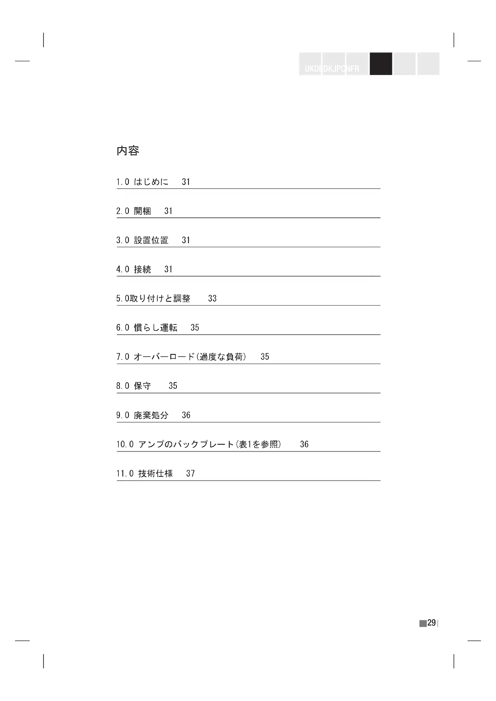 1.0はじめに 31 2.0開梱 31 3.0設置位置 31 4.0接続 31 5.0取り付けと調整 33 6.0慣らし運転 35 7.0オーバーロード(過度な負荷) 35 8.0保守 35 9.0廃棄処分 36 10.0アンプのバックプレート(表1を参照) 36 11.0技術仕様 3730