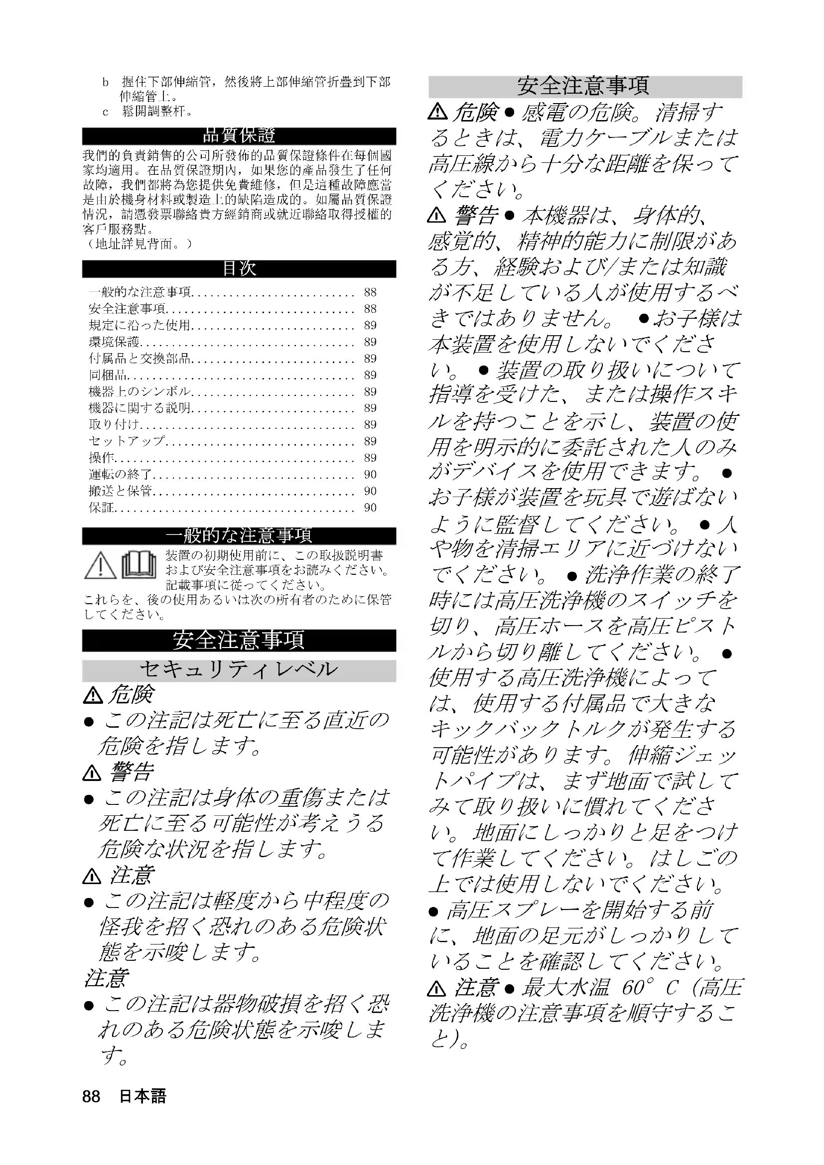 スプレーガンを伸縮ジェットパイプのホルダーに取り付ける前に、高圧洗浄機ホースの操作説明書に従って、高圧洗浄機ホースをハンドスプレーガンに接続する必要があります。 伸縮ジェットパイプは、ジョイント部で接続された延長可能な2本のパイプで構成されています。ジョイント部により、伸縮ジェットパイプを最大180°までさまざまな角度で固定できます。伸縮パイプを引き出す歳と角度を調整する際、伸縮ジェットパイプをガンホルダーに置いておくことがで 一般的な警告標識より大きなキックバックトルクの恐れ90 中文