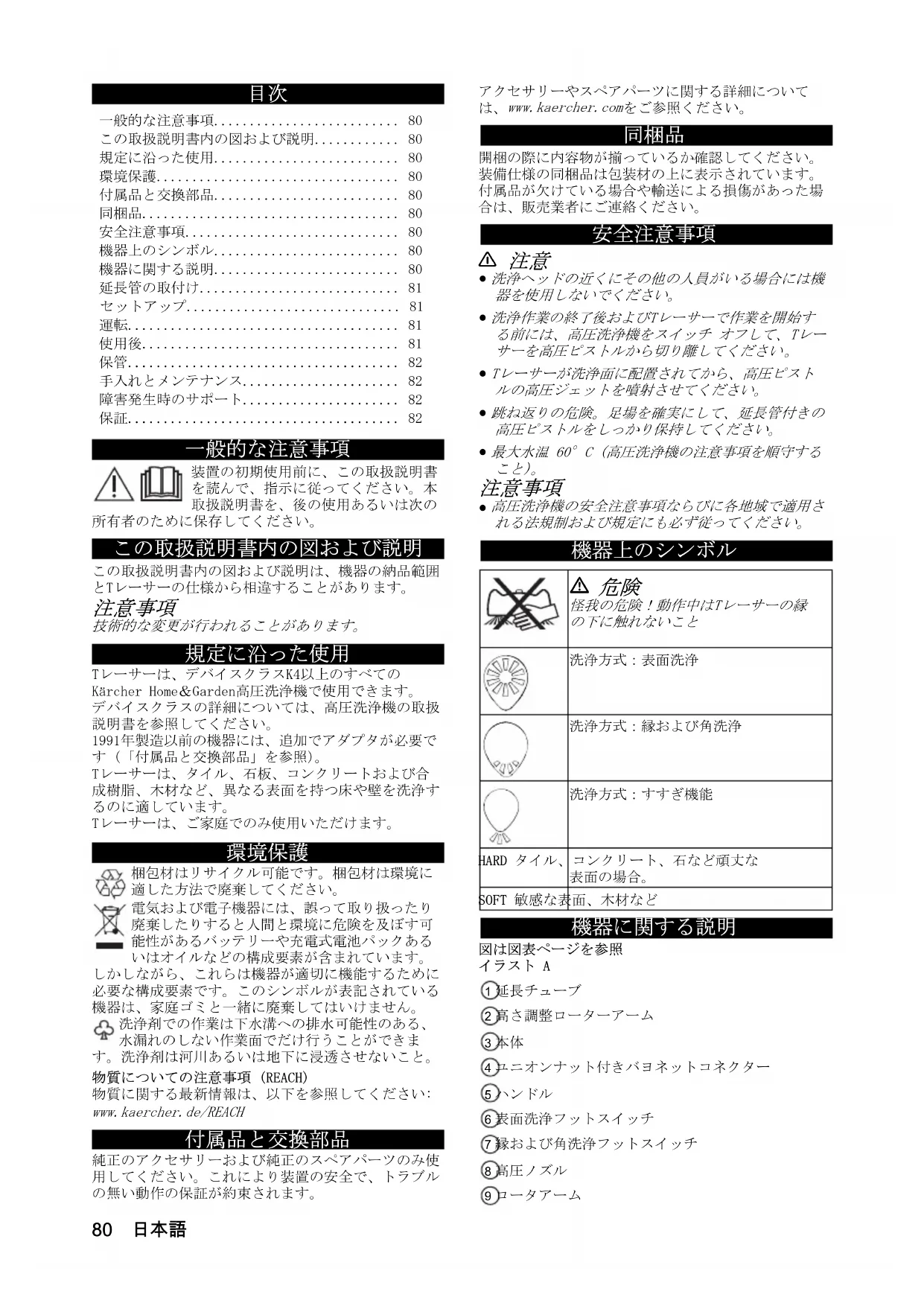 梱包材はリサイクル可能です。梱包材は環境に 適した方法で廃棄してください。 電気および電子機器には、誤って取り扱ったり 廃棄したりすると人間と環境に危険を及ぼす可 能性があるバッテリーや充電式電池パックある いはオイルなどの構成要素が含まれています。 しかしながら、これらは機器が適切に機能するために 必要な構成要素です。このシンボルが表記されている 機器は、家庭ゴミと一緒に廃棄してはいけません。 洗浄剤での作業は下水溝への排水可能性のある、 水漏れのしない作業面でだけ行うことができま す。洗浄剤は河川あるいは地下に浸透させないこと。 物質についての注意事項 (REACH) 物質に関する最新情報は、以下を参照してください: www.kaercher.de/REACH