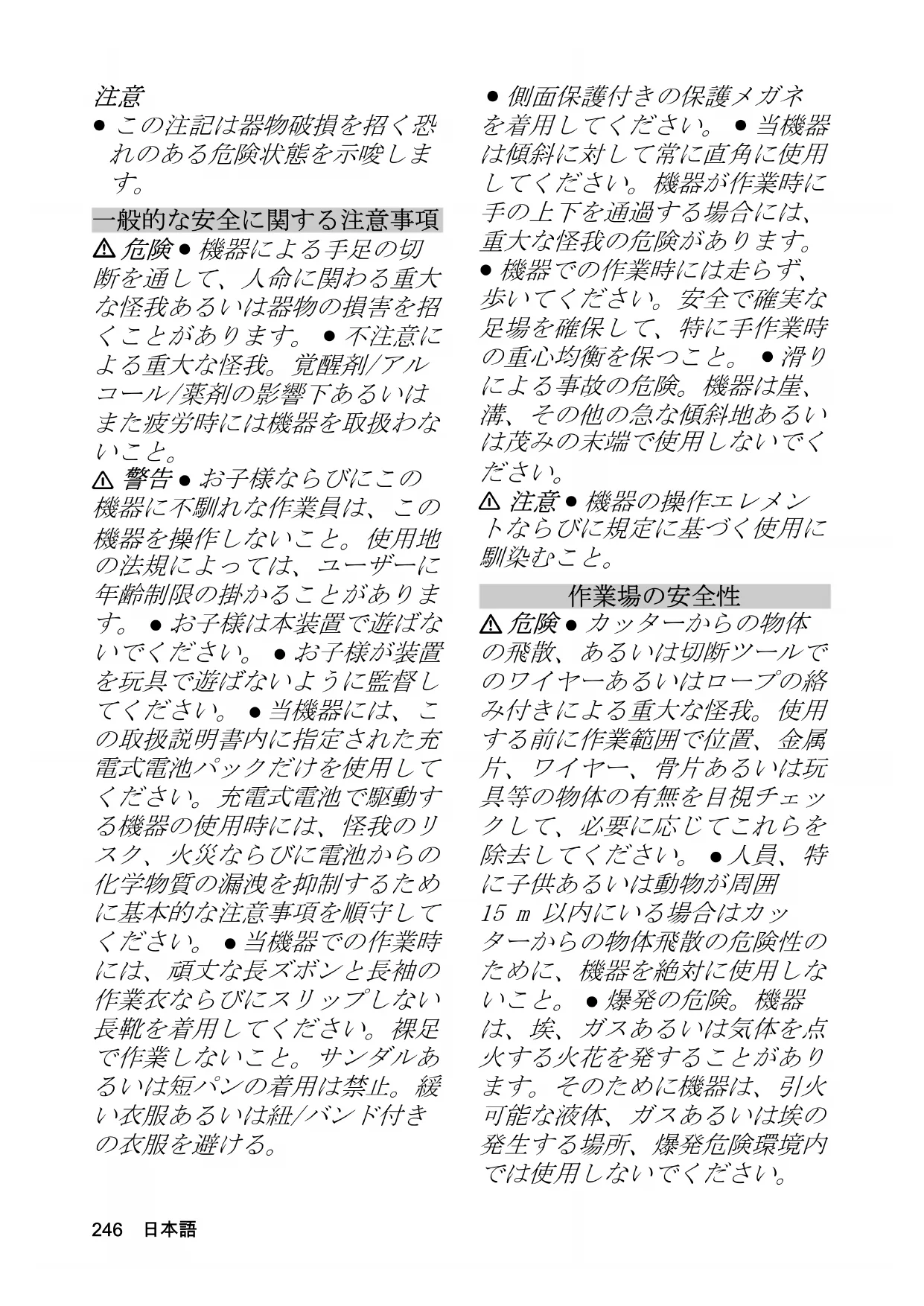 機器には過負荷保護が装備されています。過負荷が検知されると、機器は自動的にスイッチ オフします。 すべての警告および安全注意事項に従ってください。当製品を使用する前に、すべての指示事項を読んで理解してください。飛散するに注意すること。すべての第三者、特に子供および家庭動物を作業範囲から少なくとも 15 m離してく 鋭いカッターに注意すること。モーターのスイッチ オフ後にも、ブレードは回り続け メンテナンス前に、安全キーを抜き取ってください。作業中には適切な視覚および聴覚保護具を着用すること。急な傾斜地では作業しないこと。当機器を雨、湿気に晒さないでください。250 日本語