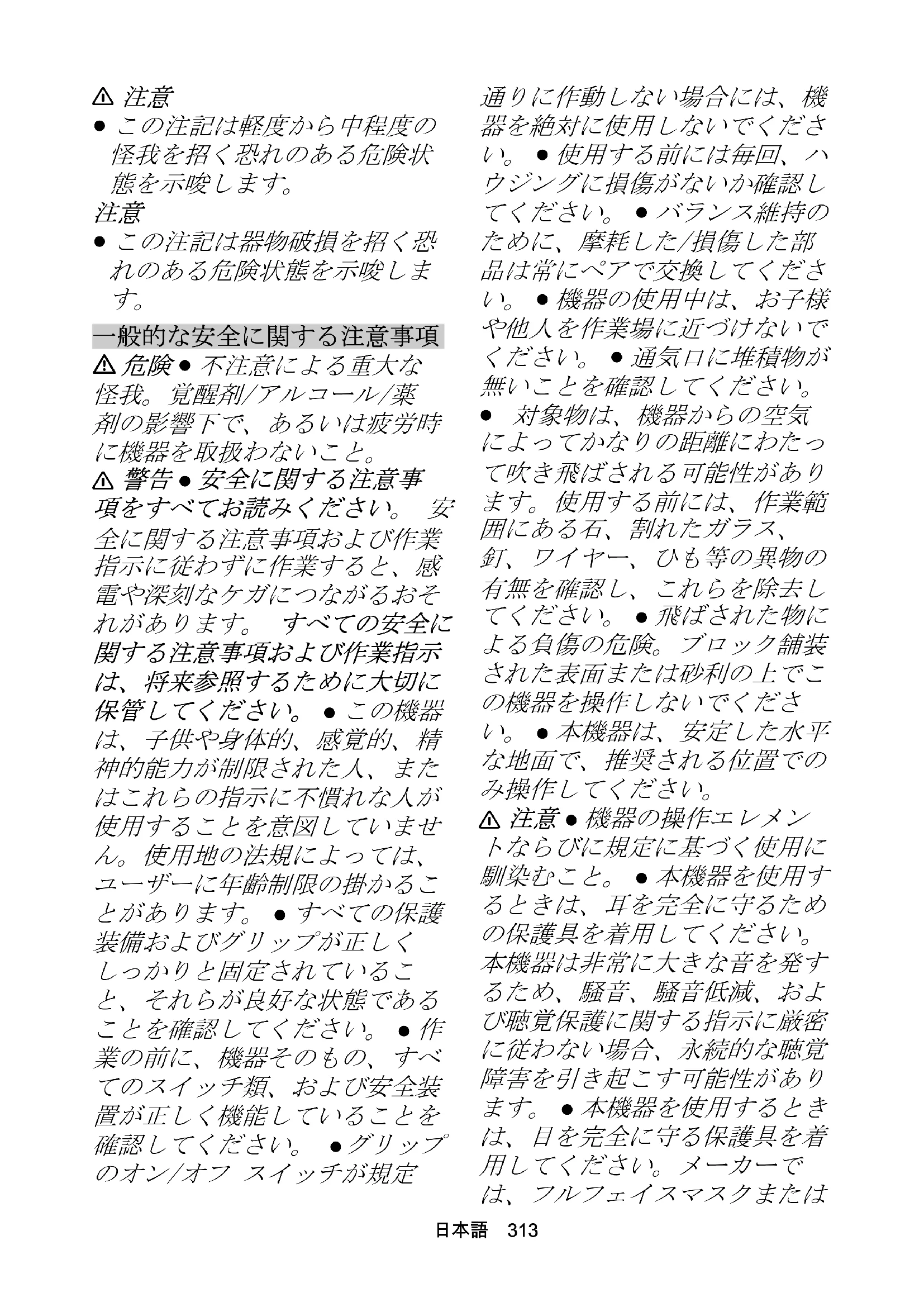 は、目を完全に守る保護具を着 用してください。メーカーで は、フルフェイスマスクまたは314 日本語 隙間のできないゴーグルの着用 を強く推奨します。通常の眼鏡 やサングラスでは、飛ばされた 物から保護できません。